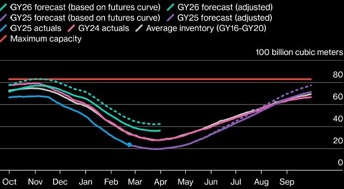 К концу зимы запасы газа в подземных хранилищах (ПХГ) Европы упадут до 24%, что на 9 процентных пунктов ниже исторической нормы — BloombergNEF Пост взят с международного финтех-медиа ресурса [M O N D I A R A](https://mondiara.com) [Скачать](https://apps.apple.com/ru/app/m-o-n-d-i-a-r-a/id6475953453) приложение в App Store [Скачать](https://play.google.com/store/apps/details?id=com.mondiara.app) приложение в Google Play
