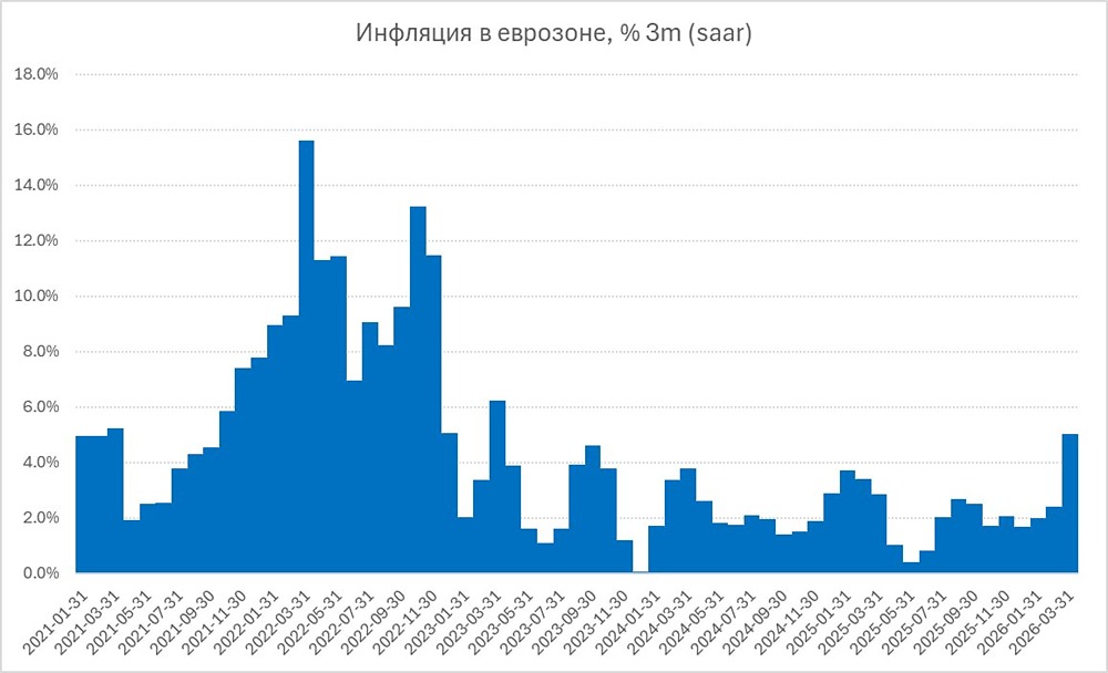 ❗️ За последние пару дней значимо ничего не изменилось, ежедневные потери нефти, газа и ряда других ресурсов так и продолжаются, с точки зрения физического рынка нефти больших изменений нет. Трамп продолжал угрожать ударами по энергетике Ирана, подтягивать морпехов, отправил очередной авианосец в регион, но одновременно заявил, что может и выйти из операции, а потом что осталось 2-3 недели [дольше Конгресс не разрешит?]: «Мы очень близки к тому, чтобы закончить эту войну. Нам не обязательно, чтобы Ормузский пролив был открыт, чтобы объявить победу. Мы можем уйти, а пусть другие страны сами его охраняют». Рынки немного порадовались, акции — вверх, нефть — вниз до ~$104 за баррель [а вдруг все же «TACO»?], на деле просто надо было квартал закрыть покомфортнее, похоже, да и у Трампа каждый раз, как Brent к $120 заходит, начинается «мирное обострение». Хотя, конечно, бензин по $4+ за галлон точно давит. На G7 министр финансов США С. Бессент рассказывал о том, что ценовой шок будет «краткосрочным», на что ему резко возразила глава ЕЦБ К. Лагард, заявив, что энергетический шок уже перерос в структурный. Первые данные по инфляции за март начали выходить в Европе: инфляция в еврозоне ускорилась до 1.2% м/м и 2.5% г/г, в основном за счет резкого скачка цен на энергию на 6.6% м/м и 4.9% г/г. ЕЦБ оценил рост цен в 0.7% м/м с поправкой на сезонность, средняя за 3 месяца 5% (saar), и эффекты роста цен еще далеко не полностью в цене. В Германии инфляция ускорилась до 2.8%, в Испании — до 3.3% г/г, во Франции пока скромные 1.7% г/г, но тут эффекты будут в апрельских цифрах. США тоже предстоит скоро отчитаться, и не лучше, можно ожидать ускорения инфляции до 0.8-1% м/м и более 3.5% г/г с движением в район 4% чуть позднее — мечта Трампа о снижении ставок тает на глазах. Хотя Дж. Пауэлл пока в высказываниях был достаточно осторожен — «надо подождать» [как всегда]. В целом пока заявления Трампа скорее из области очередных вербальных интервенций, в остальном мало что изменилось. Источник: TruEcon
