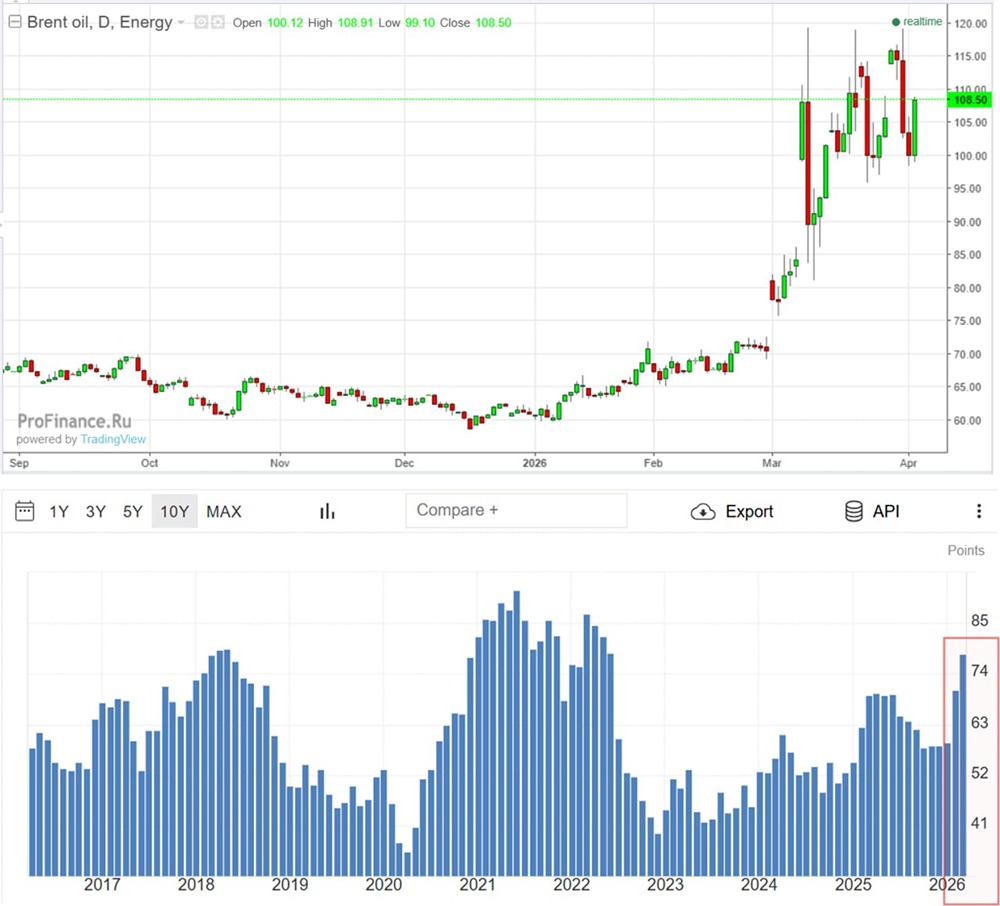 ⚠️ Конфликт США/Израиля с Ираном продолжается 34-й день, нефть Brent ~$100-110 за баррель. Ормузский пролив остаётся de facto закрытым (трафик минимальный, менее 5–10 судов в сутки). Но все же КСИР достаточно регулярно дает разрешения на проходы, в т. ч. для Ирака и поставок в Индию. Саудовская Аравия, по оценке Bloomberg, смогла нарастить поставки сырой нефти через Янбу до >4.5 mb/d к концу месяца — это ~2/3 от экспорта до операции Трампа, в среднем за март экспортировала 3.3 mb/d — падение на 50%. Это + разрешения КСИР в целом стабилизируют ситуацию на текущих уровнях потери поставок и добычи, но сохранение этого статус-кво будет вести к дальнейшей деградации добычи/поставок и исчерпанию запасов. Еще около 0.8 mb/d за последнюю неделю выпадет российской сырой нефти по данным ЦЦИ, но это, по сути, то, что не дойдет до потребителя еще месяца через два [зато дойдет в виде более высокой цены Urals по всем остальным поставкам]. ❗️ Важно понимать, что среднее время морской доставки нефти в мире около 4-5 недель, в БВ в Азию 2-5 недель — дальше все более явно будут проявляться значимые эффекты от физического падения поставок с БВ на рынках потребителей. Трамп обещает все решить за 2-3 недели (в очередной раз), а если Иран не согласится на его условия, нанести удары по энергетике и нефти — это приведет к совершенно иному этапу эскалации и разрушению инфраструктуры и поставок. Но пока, скорее, Трамп ищет возможности как-то сделать "TACO". ❓ Много разговоров о том, что есть жесткий дедлайн 60 дней, после чего нужно разрешение Конгресса, на деле многие президенты США находили возможность обойти и проигнорировать это ограничение. Отчет ISM по США за март показал резкий рост ценовых индексов по опросам американских производителей. Индекс цен ISM вырос до 78.3 — максимум с лета 2022 года, практически все отрасли США указывают на рост цен. Источник: TruEcon