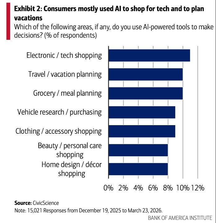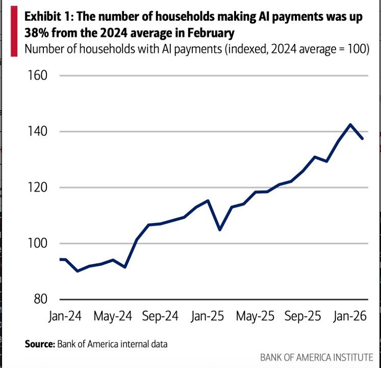 ❗️ Окупаемость ИИ постепенно начинает выполняться за счёт американских домохозяйств. Согласно данным Bank of America о платежах, примерно 3% домохозяйств, обслуживаемых BofA, оплачивали услуги ИИ в 2026 году, при этом каждое домохозяйство тратило в среднем 20 долларов по состоянию на февраль — увеличение на 10,4% по сравнению с предыдущим годом. По мере того как ИИ всё больше внедряется в повседневную жизнь и появляются подписки более высокого уровня, BofA Global Research ожидает, что потенциальный рынок только в потребительском секторе США может вырасти до 75 миллиардов долларов в год, чему способствует растущая готовность потребителей платить за удобство и экономию времени (что показывает ряд соцопросов). Тем не менее, по сравнению с другими подписками, такими как музыка или кино, внедрение ИИ всё ещё относительно низкое. Источник: Proeconomics