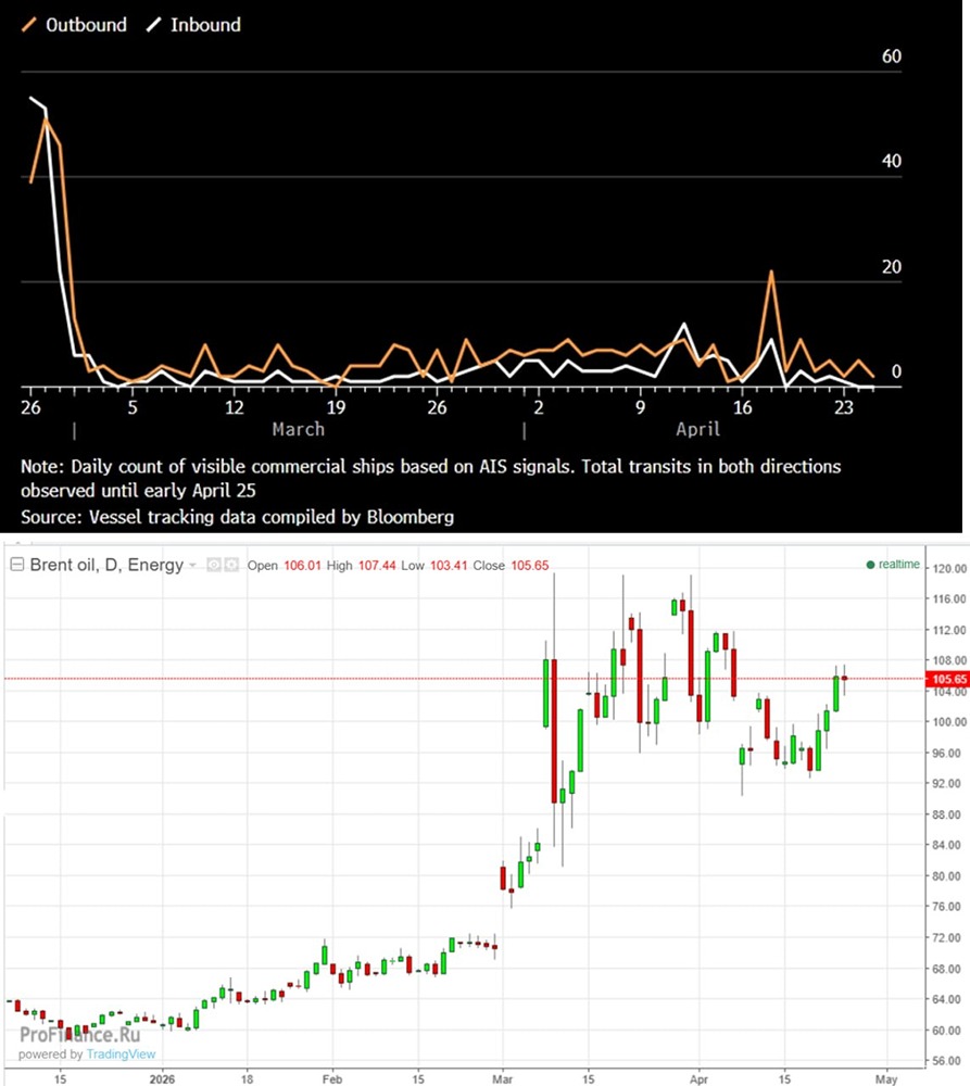 Американский потребитель, по опросам Мичиганского университета, в апреле приуныл: индекс настроений 49.8, т. е. на историческом минимуме с 1950-х. Инфляционные ожидания на год 4.7%, на пять лет — 3.5%. Потребительские настроения рухнули в еврозоне, Великобритании. Хотя в целом все пока субсидиями сглаживают ситуацию, а рынок уверен, что бюджеты/ЦБ всех спасут. 8 недель прошло с начала кризиса на Ближнем Востоке, фьючерсы на нефть держатся в районе $90–120 за баррель (налоговая цена Urals в апреле будет $95–100). Ормуз практически встал — единичные суда проходят (скорее яхты, чем танкеры), поставок как таковых практически нет. Потери мировой добычи нефти уверенно идут к 1 млрд барр., но пока это компенсируется расходованием запасов и небольшим снижением потребления. Но без существенного сокращения потребления уже скоро не обойтись. Переговоры в очередной раз зашли в очередной тупик, что неудивительно. США смогли выйти на «целых» 0.6 mb/d высвобождение нефти из стратегических запасов. Учитывая блокаду, сокращение поставок нефти на мировой рынок продолжилось (еще -2...-3 mb/d в последние недели), а использование запасов ускорится, т. к. спрос пока остается на высоких уровнях и поддерживается госсубсидиями. На деле это в какой-то момент может привести к резкой перестановке цен вверх. Хотя есть и другой путь — жесткие административные ограничения, когда ограничение потребления будут происходить через прямые запреты, а не ценовые ограничения. Текущие цены $100 +/- ценовые ограничения особо не создают, тем более что во многих странах 10–20% этой цены сейчас компенсируется через снижение налогов и субсидии. В целом ситуация такова, что как минимум на горизонте квартала — двух цены будут повышенными, даже если все «завтра» решится, хотя пока шансов на какие-то быстрые решения мало. Риск сходить на $150 сейчас выше, чем риск упасть, хотя видно, что Трамп и Ко крайне нервно реагируют при любом подходе к $120 за баррель, и действительно удержание ниже пока позволяет сохранять рынку надежду, что все «рассосется», закрепление выше заставит пересматривать эти взгляды. Источник: TruEcon