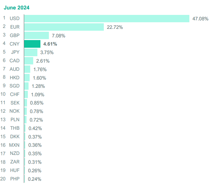 В июне доля переводов в юанях через систему SWIFT достигла 4,61%.