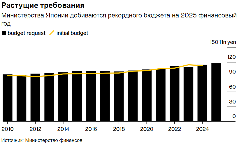 Новость: нейтральная. Министерства Японии запросили рекордные 811 миллиардов долларов бюджета на будущий год. Министерства Японии установили новый рекорд по своим бюджетным запросам на год, начинающийся в апреле 2025 года, поскольку страна борется с необходимостью увеличить расходы на социальное обеспечение и оборону, сохраняя при этом огромный долг под контролем. Министерства запросили в общей сложности 117,6 триллиона ¥ (811 миллиардов долларов) на следующий финансовый год, что на 2,8% больше по сравнению с первоначальным спросом в 114 триллионов ¥ на текущий год, согласно сообщению министерства финансов в среду. За последние пять лет бюджетные запросы увеличивались в среднем на 2,2% каждый год, но инфляция более чем на 2% сократила масштабы увеличения в реальном выражении за последние пару лет. Хотя Япония по-прежнему обременена самым большим государственным долгом среди развитых стран, она добилась некоторого начального прогресса в установлении контроля над своими финансами. В июле правительство указало, что Япония, как ожидается, достигнет своей основной цели по балансу в следующем финансовом году, наконец достигнув этой давней цели после более чем десятилетних задержек. “Учитывая экономический рост и, как следствие, увеличение налоговых поступлений, такие темпы роста бюджетных запросов должны быть почти нейтральными для первичного баланса”, - сказал Уичиро Нозаки, экономист Nomura Securities Co. “У меня не складывается впечатления, что запросы резко выросли по сравнению с предыдущими годами”. Даже если поступят запросы на дополнительные расходы по незавершенным статьям, Нозаки сказал, что ожидает, что первоначальный бюджет в конечном итоге окажется ниже запрошенной суммы, когда он будет окончательно утвержден в конце года. Рекордные бюджетные запросы отражают увеличение расходов во многих областях, включая оборону. Военные запрашивают рекордные ¥ 8,5 триллиона в ответ на обещание премьер-министра Фумио Кисиды укрепить обороноспособность страны. Министерство социального обеспечения также запрашивает рекордные 34,3 триллиона ¥, частично из-за растущих расходов на социальное обеспечение, вызванных быстрым старением населения. Ожидается, что из-за повышения ставок Банком Японии и связанного с этим роста доходности расходы на обслуживание долга возрастут. Министерство финансов запрашивает 28,9 триллиона ¥ на обслуживание долга в 2025 финансовом году, что на 7% больше, чем в текущем финансовом году. Министерство установило первоначальную ставку, используемую для расчета процентных выплат по находящимся в обращении облигациям, на уровне 2,1% по сравнению с 1,9% в текущем году. Общий государственный долг Японии эквивалентен 255% ее экономики в этом году, по данным Международного валютного фонда. Прогноз первичного баланса не учитывает связанные с этим расходы на обслуживание этого долга. Решение тяжелого долгового бремени Японии станет ключевым вопросом в предстоящей гонке за лидерство правящей Либерально-демократической партии, которая фактически выберет нового премьер-министра страны. Более 10 потенциальных кандидатов претендуют на высшую должность в Японии, придерживаясь различных взглядов на налогово-бюджетную политику. В то время как министр цифровых технологий Коно Таро подчеркнул необходимость финансовой дисциплины, бы