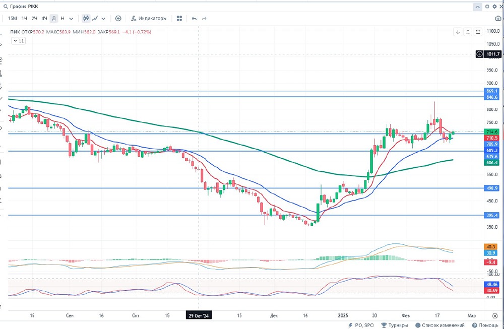 Добрый день уважаемые дамы и господа, инвесторы и трейдеры! 🚨ПИК-специализированный застройщик — крупнейшая российская девелоперская компания, реализующая проекты в Москве, Московской области и регионах России. ПИК специализируется на строительстве и реализации жилья комфорт-класса преимущественно в сегменте индустриального домостроения. С начала деятельности (1994 год) ПИК построил более 30 млн м² жилья, обеспечив квартирами более 2 млн человек. ✅Позитив: 📍1. Компания развивает не только массовое жильё, но и коммерческую недвижимость , а это снижает зависимость от одного сегмента. 📍2. Контроль полного цикла: от производства стройматериалов до управления готовыми объектами ⛔Негатив: 📍1. Факты банкротства застройщиков в регионах 📍2. Снижение продаж жилья на 19–35% 📍3. Упадок спроса на ипотеку в новостройках 📍4. Высокая КС 📍5. Высокий уровень долга 📍6. Зависимость от рефинансирования старых займов 📍7. Не выплачивает дивиденды 📢Дополнительно: 🥇1. ПИК продал краснодарской компании Dogma две площадки в Москве, на которых суммарно можно построить более 200 тыс. кв м жилья. Сумма сделки могла составить ₽12–13 млрд. 💵Дивиденды: Согласно дивидендной политике ПИК (утв. апрель 2021) рекомендованный целевой уровень ежегодных дивидендов составляет не менее 30% скорректированной чистой прибыли по МСФО. Выплаты не производятся из-за сложной геополитической ситуации. 💴 - $PIKK : ФА Капитализация - 448.3 млрд ₽ Кол-во акций ао– 660.5 млн Кол-во акций ап– 0.0 млн Р/Е - 7.14 P/S - 0.77 P/BV - 1.30 ROE - 17.9% EV/EBITDA - 4.30 DSI 0.00 💡Данные взяты из официальных и публичных источников и отражают состояние за базовый год, а не на момент публикации поста. ⏰ - ТФ 1 DAY 🛠 ТА - скользящие, стохастик, объем, МАСD, уровни. 📈- тренд вверх ‼- Гистограмма MACD в отрицательных значениях, линии MACD находятся в положительных значениях. Стохастик находится в районе средней линии и снижается. 17 января цена пересекла снизу вверх 100 ЕМА и показывает восходящую тенденцию. При закрытии дня ниже 685,8 возможен разворот в шорт. ⏰ -ТФ 4 часа 🛠 ТА - скользящие, стохастик, объем, МАСD, уровни. 📈- тренд вверх ‼ - Гистограмма MACD в положительных значениях, линии MACD находятся в отрицательных значениях. Стохастик находится в районе средней линии и растет. При закрытии ниже 696,3 возможен разворот в шорт. В данный момент цена пытается закрепиться выше отметки сопротивления в случае закрепления возможен поход до 755, но вероятен и ретест 640 , а там смотреть на динамику далее. 📊За 6 (08.24-02.25) месяцев цена снизилась более чем на 8 % . Мин. Рrice = 352,1 Мах. Рrice = 815.0 📌 Цены смены тренда указаны в соответствии с ТФ и являются ориентировочными и со временем смещаются.📌 🃏Всем профита и до скорой встречи!🃏