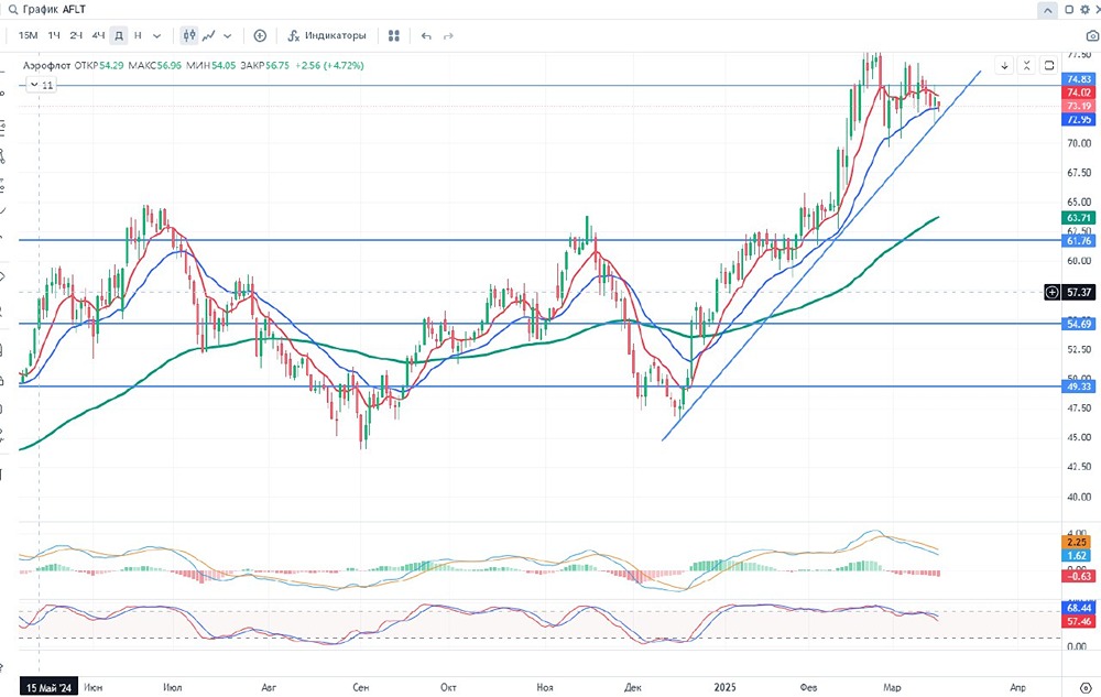 Добрый день уважаемые дамы и господа, инвесторы и трейдеры! 🚨АЭРОФЛОТ является лидером гражданской авиации России, национальным перевозчиком. Генеральный директор авиакомпании с 8 апреля 2022 года — Сергей Александровский. Аэрофлот, основанный 17 марта 1923 года, является самым сильным брендом среди ведущих российских корпораций и сильнейшим авиационным брендом в мире по данным независимого агентства Brand Finance. Аэрофлот базируется в московском аэропорту Шереметьево, 31 мая 2021 года открыл свой второй международный хаб в Красноярске. В России имеет также еще четыре филиала: в Санкт-Петербурге, Калининграде, Перми и Владивостоке. ✅Позитив: 📍1. Планируемая выплата дивидендов 📍2. Финансирование приобретения авиадвигателей и выпуск облигаций 📍3. Крупнейшая авиакомпания России , имеет статус национального перевозчика. 📍4. Контроль над лоукостером «Победа», грузовые перевозки (Аэрофлот-Карго) снижают зависимость от пассажирских авиаперевозок. ⛔Негатив: 📍1. Ограничения на поставки запчастей и аренду самолетов после 2022 г. требуют переориентации на азиатские рынки и импортозамещения. 📍2. В 2025 не смогут перевезти больше пассажиров, т.к. загрузка на максимуме 📢Дополнительно: 🥇1. Чистая прибыль «Аэрофлота» по МСФО за 2024 год составила ₽55,02 млрд против убытка ₽14,02 млрд в предыдущем году. 🥈2. Выручка увеличилась на 40% до ₽856,8 млрд против ₽612,12 млрд годом ранее. 🥉3. «Аэрофлот» в январе 2025 года перевезла 3,93 млн пассажиров, что на 1,9% больше по сравнению с 3,85 млн пассажиров годом ранее. Пассажирооборот вырос на 3,4%, до 11,1 млрд пкм. Занятость кресел снизилась на 0,9 п.п., составив 86%. 💵Дивиденды: В феврале 2025 г. совет директоров Аэрофлота утвердил новую редакцию положения о дивидендной политике. Целевой уровень доли прибыли, рекомендуемой к направлению на выплату дивидендов, установлен в размере 50% чистой прибыли по МФСО, скорректированной на неденежные эффекты. В тоже время, при наличии оснований, совет директоров может дополнительно скорректировать чистую прибыль с учетом отраслевой специфики, а также изменить долю прибыли, направляемую на выплату дивидендов. 💴 - $AFLT : ФА Чистые активы - (-55.7) млрд ₽ Кол-во акций ао– 3976.0 млн Кол-во акций ап– 0.0 млн Р/Е - 4.00 P/S - 0.27 P/BV - (-3.04) ROE - (-105.0)% EV/EBITDA - 3.88 DSI 0.0 ⏰ - ТФ 1 DAY 🛠 ТА - скользящие, стохастик, объем, МАСD, уровни. 📈- тренд вверх ‼- Гистограмма MACD в отрицательных значениях, линии MACD находятся в положительных значениях. Стохастик вышел из зоны перекупленности. 20 декабря цена пересекла сверху вниз 100 ЕМА и показывает нисходящую тенденцию. При закрытии дня ниже 72,95 возможен разворот в шорт. Однако в этом случае есть возможность отбоя от 71.51. В более глобальной перспективе все же более реалистичный сценарий боковик с последующим походом ниже, все же основной драйвер для роста будет это смягчение санкций и рост индекса в целом. ⏰ -ТФ 4 часа 🛠 ТА - скользящие, стохастик, объем, МАСD, уровни. 📈- тренд вниз ‼ - Гистограмма MACD в положительных значениях, линии MACD находятся в отрицательных значениях. Стохастик находится выше средней линии и пока растет. При закрытии выше 73,61 возможен разворот в лонг. 📊За 6 (09.24-02.25) месяцев цена выросла более чем на 35 % . Мин. Рrice = 44,00 Мах. Рrice = 78.45 📌 Цены смены тренда указаны в соответствии с ТФ и являются ориентировочными и со временем смещаются.📌 🃏Всем профита и до скорой встречи!🃏 Мой телегра