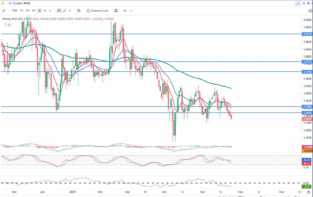 Добрый день, уважаемые дамы и господа, инвесторы и трейдеры! 🚨 ПАО «Интер РАО» — российская энергетическая компания, управляющая активами в России. В сферу деятельности Интер РАО входит производство и сбыт электрической и тепловой энергии, международная энергетическая торговля, инженерные услуги, проектирование и строительство энергообъектов. ✅Позитив: 📍1. Компания обладает значительной «денежной кубышкой» 📍2. Выплачивает дивиденды 📍3. Строительство Новоленской ТЭС и модернизация 20 объектов к 2028 году 📍4. После прекращения поставок в ЕС компания нарастила экспорт в Китай, Казахстан и Монголию. ⛔Негатив: 📍1. Задержки в поставках оборудования для модернизации энергоблоков Интер РАО 📍2. Снижение объема потребления электроэнергии в России 📍3. Потеря европейских активов 📍4. Тарифы на электроэнергию и условия программ регулируются государством 📢Дополнительно: 🥇1. Убыток «Интер РАО» по РСБУ за 3 месяца 2025 года составил ₽0,3 млрд против прибыли ₽4,4 млрд в предыдущем году. 🥈2. Выручка увеличилась на 25,7% до ₽13,7 млрд против ₽10,9 млрд годом ранее. 🥉3. Совет директоров «Интер РАО» рекомендовал выплатить дивиденды по итогам 2024 года в размере ₽0,35375651688851 на одну обыкновенную акцию. 💵Дивиденды: (готово) Дивидендная политика Интер РАО предполагает выплату 25% от прибыли МСФО. 💴 - $IRAO: ФА Чистые активы - 1024.0 млрд ₽ Кол-во акций ао–104400.0 млн Кол-во акций ап– 0.0 млн Р/Е - 2.63 P/S - 0.25 P/BV - 0.38 ROE - 14,4% EV/EBITDA - (-0.71) DSI = 0.96 Данные взяты из официальных и публичных источников и отражают состояние 2024 , а не на момент публикации поста. ⏰ - ТФ 1 DAY 🛠 ТА - скользящие, стохастик, объем, МАСD, уровни. 📈- тренд вниз ‼- Гистограмма MACD в отрицательных значениях, линии MACD находятся в отрицательных значениях. Стохастик находится ниже средней линии и снижается. 6 марта цена пересекла сверху вниз 100 ЕМА и показывает нисходящую тенденцию. При закрытии дня выше 3.5374 возможен разворот в лонг. ⏰ -ТФ 4 часа 🛠 ТА - скользящие, стохастик, объем, МАСD, уровни. 📈- тренд вниз ‼ - Гистограмма MACD в отрицательных значениях, линии MACD находятся в отрицательных значениях. Стохастик находится в зоне перепроданности. 19 мая цена пересекла сверху вниз 100 ЕМА и показывает нисходящую тенденцию. При закрытии выше 3,4944 возможен разворот в лонг. 📈 Возможные варианты развития: На данный момент цена ниже двух сопротивлений. В случае закрытия дня ниже 3,471 открыт путь до 3,4485. Уход выше сопротивления 3,4945 даст надежду на смену тренда с последующим походом к 3,535-3,55. За 6 (11.24-04.25) месяцев цена снизилась более чем на 5 % . Мин. Рrice = 3.30 Мах. Рrice = 4.05 📌 Цены смены тренда указаны в соответствии с ТФ и являются ориентировочными и со временем смещаются.📌 🃏Всем профита и до скорой встречи!🃏