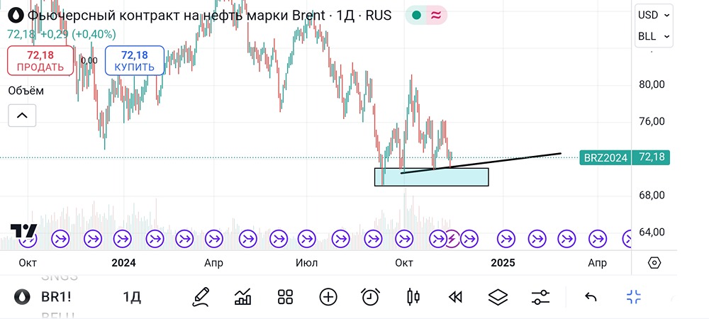 🐹Нефть. Брент. 🥜Спрашивали, отвечаю. 🥜Я не мониторю данный актив, по этому тонкостей и нюансов не знаю. 🥜Если смотреть график по моей классике, то видно не вооружённым взглядом старшая низходящая тенденция с апреля месяца. 🥜Сейчас локально актив запилил. Ориентироваться можно на локальную трендовую. И на ценовой диапазон. Уход ниже каждого из ориентиров является отменой спекулятивной торговой идеи в Лонг. Сигналом же на Лонг как обычно является положительная реакция! 🥜Что касается среднесрока, то ничего хорошего я не ожидаю. Если слова Трампа не просто предвыборный трёп, то на актив будут давить! Лучший вариант, если нефть будет пилить в том ценовом диапазоне, что и последние два года. Считаю, это будет лучшим подарком! Но это будет не просто и Опек+ уже не в восторге от снижения добычи и начинают сворачивать эту лавочку. ❗️Не является индивидуальной инвестиционной рекомендацией. _________________________ 🐹Хомяк в Телеграм: https://t.me/+Kgh36Hk6zQ4yN2Ni 🐹Сканер волатильности акций от Хомяка: https://t.me/HunterMoexBot?start=khomyak