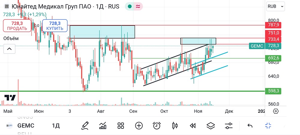 🐹ЮМГ. #GEMC 🥜Бумаге не составило большого труда вскарабкаться в верхнюю часть предыдущего восходящего канала. Да, в бумаге засело много спекулянтов, которые фиксируются на любом импульсном движении, но не смотря на это она до сих пор выглядит сильно! 🥜Не знаю с чего к ней такое внимание, возможно есть какие-то интересанты или инсайдеры и возможно под конец года мы услышим о дивах из нераспределёнки, но это пока лишь плоды воображения. Сам держу, на локальные импульсы не реагирую, хочу увидеть развязку! 🥜В целом впереди две сложные зоны продавцов. Одна действующая и пока стоит ориентироваться на неё. Выше 750 идти пока не дают, фиксят со страшной силой! Посмотрим, пока график не загибает, порох в пороховницах есть! ❗️Не является индивидуальной инвестиционной рекомендацией. _________________________ 🐹Хомяк в Телеграм: https://t.me/+Kgh36Hk6zQ4yN2Ni 🐹Сканер волатильности акций от Хомяка: https://t.me/HunterMoexBot?start=khomyak