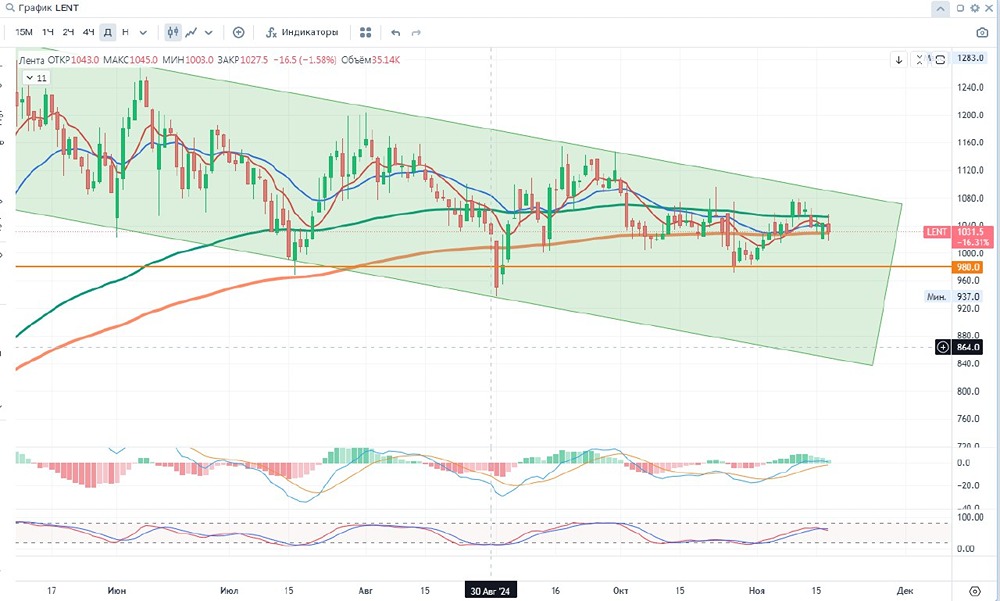 Добрый день уважаемые дамы и господа, инвесторы и трейдеры! 🚨МКПАО «Лента» – ведущий многоформатный продуктовый и FMCG ритейлер в России. Компания развивает форматы гипермаркетов, супермаркетов, а также недавно запустила новый формат магазинов у дома под брендом «Мини Лента». «Лента» также дает покупателям возможность совершать покупки онлайн, используя свои сервисы «Лента Онлайн», сервисы онлайн-партнеров и платформы «Утконос». По состоянию на 30 сентября 2022 года управляла 254 гипермаркетами и 557 супермаркетами, а также магазинами «Лента Мини» в более чем 200 городах России с торговой площадью почти 1,78 млн квадратных метров. Средняя торговая площадь гипермаркета «Лента» составляет примерно 5 500 квадратных метров, средняя площадь супермаркета «Лента» — 800 квадратных метров. а формат «Мини-Лента» в среднем составляет 500 метров. Компания управляет 14 распределительными центрами для снабжения всех своих магазинов. ✅Позитив: 📍1. Экспансия сети магазинов малого формата «Монетка» 📍2. Чистый долг/EBITDA ритейлера Лента снизился до 1,4х к концу сентября 2024 года по сравнению с 2,8х на конец 2023 года. 📍3. Компания хочет удвоить выручку 2020 года к 2025 году до 1 трлн рублей ⛔Негатив: 📍1. Не выплачивает дивиденды. 📍2. Суд обратил убыток от пожара в томской "Ленте" в 1,2 млрд руб. на подрядчиков гипермаркета 📢Дополнительно: 🥇1. Розничная выручка «Ленты» за 9 месяцев 2024 года составила ₽618,9 млрд, увеличившись на 60,9%. Онлайн-продажи выросли на 27,4% до ₽45,3 млрд. 🥈2. LFL - продажи увеличились на 13,9%, трафик — на 4,6%, а средний чек — на 8,9%. Общая торговая площадь увеличилась на 39,8% и составила 2 379,1 тыс. кв. м. 🥉3. Чистая прибыль «Ленты» по МСФО за 9 месяцев 2024 года составила ₽14,4 млрд против убытка ₽2,8 млрд в предыдущем году. Выручка увеличилась на 58,9% до ₽624,6 млрд против ₽393,1 млрд годом ранее. 💵Дивиденды: Согласно дивидендной политике (ноябрь 2021 г.) Лента планирует направлять на выплаты акционерам не более 100% свободного денежного потока (FCF) за соответствующий период при условии, что коэффициент NetDebt/EBITDA не превысит 1,5х. Если NetDebt/EBITDA меньше 1,0х, компания может направить на дивиденды более 100% FCF. Если NetDebt/EBITDA будет больше 1,5х, на выплаты будет направлено не более 50% FCF в качестве дивидендов. Компания не выплачивает дивиденды по инфраструктурным вопросам. 💴 - $LENT : ФА Капитализация - 121.0 млрд ₽ Кол-во акций ао– 116.0 млн Кол-во акций ап– 0.0 млн Р/Е - 9.1 P/S - 0.2 P/B - 1.0 ROE - 9.5% EV/EBITDA - 5.16 ⏰ - ТФ 1 DAY 🛠 ТА - скользящие, стохастик, объем, МАСD, уровни. 📈- тренд вниз ‼- Гистограмма MACD в положительных значениях, линии MACD находятся в отрицательных значениях, но стремятся пересечь среднюю линию. Стохастик находясь выше средней линии, но снижаются. 14 ноября цена пересекла сверху вниз 100 ЕМА и показывает нисходящую тенденцию. При закрытии дня выше 1041 возможен разворот в лонг. По сути сейчас затяжной широкий боковик 995-1263. При закреплении выше 1075 возможен поход к 1100-1165 ⏰ -ТФ 4 часа 🛠 ТА - скользящие, стохастик, объем, МАСD, уровни. 📈- тренд вниз ‼ - Гистограмма MACD в отрицательных значениях, линии MACD находятся в положительных значениях. Стохастик находится ниже средней линии. При закрытии выше 1043.3 возможен разворот в лонг. 📊За 6 (04.24-09.24) месяцев цена снизилась более чем на 10% . Мин. Рrice = 937.0 Мах. Рrice = 1288.0 📌 Цены смены тренда указаны в соответствии с ТФ и являются ориентировочными и со временем смещаются.📌 🃏Всем