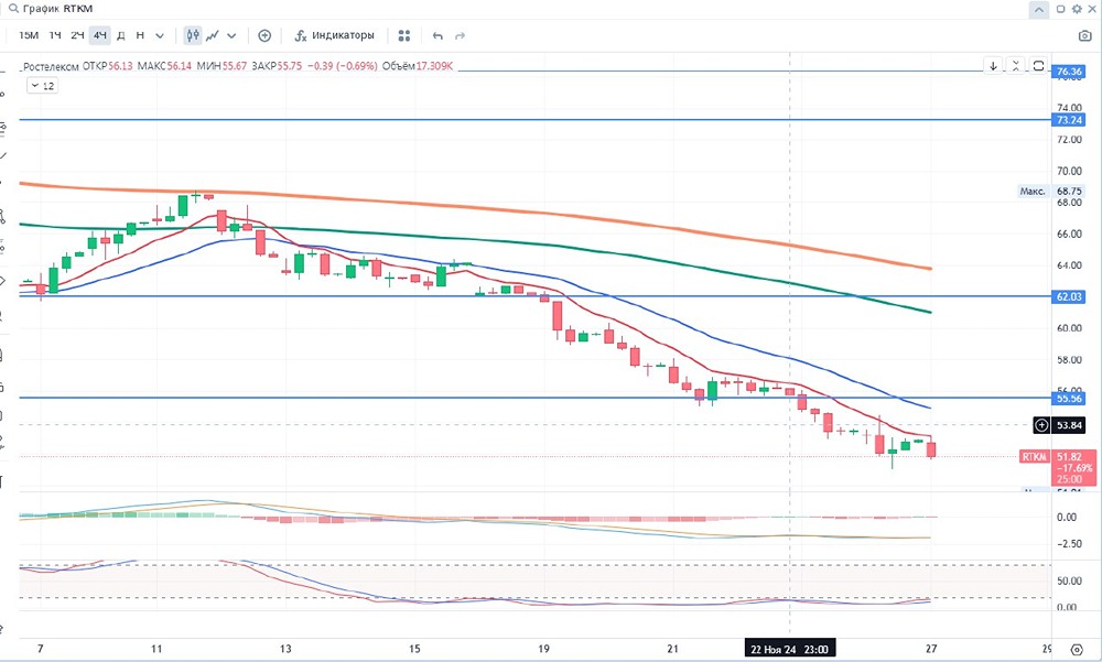 Добрый день уважаемые дамы и господа, инвесторы и трейдеры! ПАО «Ростелеком» — крупнейший в России провайдер цифровых услуг и решений, который присутствует во всех сегментах рынка и охватывает миллионы домохозяйств, государственных и частных организаций. Компания занимает лидирующие позиции на рынке услуг высокоскоростного доступа в интернет и платного телевидения. Количество клиентов услуг доступа в интернет с использованием оптических технологий составляет около 11 млн, платного ТВ «Ростелекома» — 11 млн пользователей, из них свыше 6,4 млн — IPTV. «Ростелеком» является лидером рынка телекоммуникационных услуг для органов государственной власти России и корпоративных пользователей всех уровней. Позитив: 1. Серьезное сокращение капзатрат в 2025 году может способствовать сохранению положительного свободного денежного потока 2. Подготовленная новая стратегия Ростелекома может повлиять на стоимость акций компании в будущем 3. Платит дивиденды Негатив: 1. Отложение IPO облачной дочерней компании РТК-ЦОД 2. Арест главы департамента Центра кибербезопасности и защиты Ростелекома 3. Текущий уровень задолженности 50.24% увеличился за 5 лет c 32.33%. Дополнительно: 1. Чистая прибыль «Ростелекома» по МСФО за 9 месяцев 2024 года составила ₽19,34 млрд, снизившись в 2 раза по сравнению с ₽40,45 млрд в предыдущем году. 2. Выручка увеличилась на 9,5% до ₽546,06 млрд против ₽498,46 млрд годом ранее. 3. В планах было IPO ЦОД, но у компании долг растет, рентабельность падает. И данное мероприятие отменили. Дивиденды: Дивидендная политика Ростелекома предполагает выплату в качестве дивидендов не менее 5 рублей на акцию один раз в год. Компания ежегодно планирует наращивать выплаты как минимум на 5%. Компания будет стремиться, чтобы размер дивидендных выплат (совокупно по обыкновенным и привилегированным акциям) не превышал 100% от чистой прибыли по МСФО, но в любом случае был не ниже уровня, рекомендованного Росимуществом и Правительством Российской Федерации для компаний с государственным участием (50%). В соответствии с уставом Ростелеком обязуется выплачивать дивиденды по привилегированным акциям в размере 10% чистой прибыли по РСБУ разделенной на число прив. акций, которые составляют 25% уставного капитала компании, но не менее дивидендов по обыкновенных акциям. 💴 - $RTKM : ФА Капитализация - 183.027 млрд ₽ Кол-во акций ао– 3283.0 млн Кол-во акций ап– 209.6 млн Р/Е - 5.6 P/S - 0.3 P/B - 4.6 ROE - 10.7% EV/EBITDA - 2.3 DSI 0.5 ⏰ - ТФ 1 DAY 🛠 ТА - скользящие, стохастик, объем, МАСD, уровни. 📈- тренд вниз ‼- Гистограмма MACD в отрицательных значениях, линии MACD находятся в отрицательных значениях. Стохастик находится в зоне перепроданности. 27 июня цена пересекла сверху вниз 100 ЕМА и показывает нисходящую тенденцию. При закрытии дня выше 61,03 возможен разворот в лонг. ⏰ -ТФ 4 часа 🛠 ТА - скользящие, стохастик, объем, МАСD, уровни. 📈- тренд вниз ‼ - Гистограмма MACD в отрицательных значениях, линии MACD находятся в отрицательных значениях. Стохастик находится в зоне перепроданности. При закрытии выше 54,90 возможен разворот в лонг. В случае роста первые ключевые точки это 53.06 и 54.15, но что-то судя по рынку.... За 6 (05.24-10.24) месяцев цена снизилась более чем на 35 % . Мин. Рrice = 58,9 Мах. Рrice = 108.0 📌 Цены смены тренда указаны в соответствии с ТФ и являются ориентировочными и со временем смещаются.📌 Мои каналы: БКС https://s.bcs.ru/hua6D Телега https://t.me/ua1cec_tradin