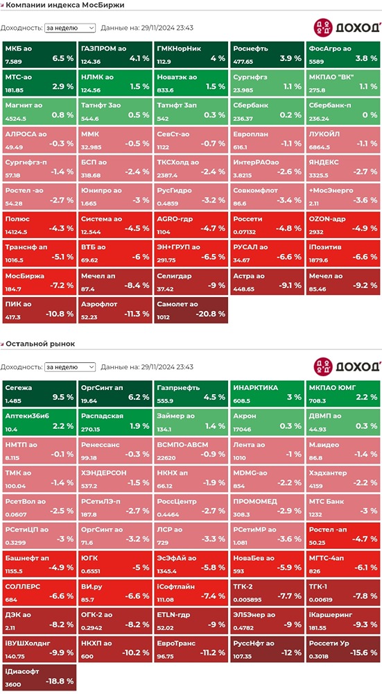 👋Друзья, всех приветствую! 🐹Снижение на рынке остановилось, но не смотря на бурный отскок и восстановление, откровенное заливное понедельника и вторника отыграть не смогли и тепловая карта смотрится страшновато. 🥜А тем временем на рынок пришла новая страшилка. Легенда такая! Крайние санкции оказали влияние на курс рубля, что в свою очередь может оказать отрицательное влияние на инфляцию и соответственно ставку уже в декабре могут поднять аж до 25%. Правда к моему удивлению, рынку как-то пофиг на это и реакции не было. Может позже(. Но вот в чём прикол. Валюта была более менее стабильна, летом экспортёрам снизили порог по обязательной продаже валютной выручке и именно с этого момента рубль начал ослабляться. А новым санкциям-то безгоду неделя! Так ставкой ли надо спасать курс или может поискать вновь золотую середину в обёме продаж валюты экспортёрами? 😉Ладно, давайте отдыхать, торговая неделя вымотала жёстко! _________________________ 🐹Хомяк в Телеграм: https://t.me/+Kgh36Hk6zQ4yN2Ni 🐹Сканер волатильности акций от Хомяка: https://t.me/HunterMoexBot?start=khomyak