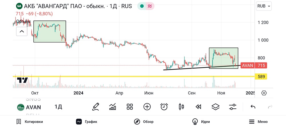 🐹Авангард. #AVAN 🥜Ну вот собственно говоря Авангардик и отстрелялся. Риски я определил правильно и перезаход смотрелся не логичным и как итог ещё до дива бумага вернулась на трендовую, а затем после отскока на дивгэпе вновь шлёпнулась на неё. 🥜Что дальше? А дальше ничего хорошего не ожидаю. Надеяться на появление интересанта, манипулятора, пампера можно, но ставить только на это, как-то не серьёзно! В отсутствии на рынке жадности, триггер остаётся один, это дивиденды. Следующий див, это май, а если выплаты за первый квартал не будет и компания решит выплатить див за полугодие, то сентябрь/октябрь. Да и размер дива может быть меньше прежнего, да и дивы этого года уже похудели. 🥜Если сравнить ситуацию с прошлым годом на графике, то это просто зеркалочка. Разгон на рекомендации/стабилизация/слив. 🥜Стоит ли перезаходить тут на трендовой? Из логики описанного выше, это не лучшая идея. Див далеко. Текущий драйвер закончился. Впереди ставка. Ближайшее будущее туманно. Если прикинуть вероятности, то логичнее бумагу пока отпустить и периодически приглядывать. Есть все шансы увидеть ценник ниже. А вот без интересанта отожмётся она на таком рынке не скоро! ❗️Не является индивидуальной инвестиционной рекомендацией. _________________________ 🐹Хомяк в Телеграм: https://t.me/+Kgh36Hk6zQ4yN2Ni 🐹Сканер волатильности акций от Хомяка: https://t.me/HunterMoexBot?start=khomyak