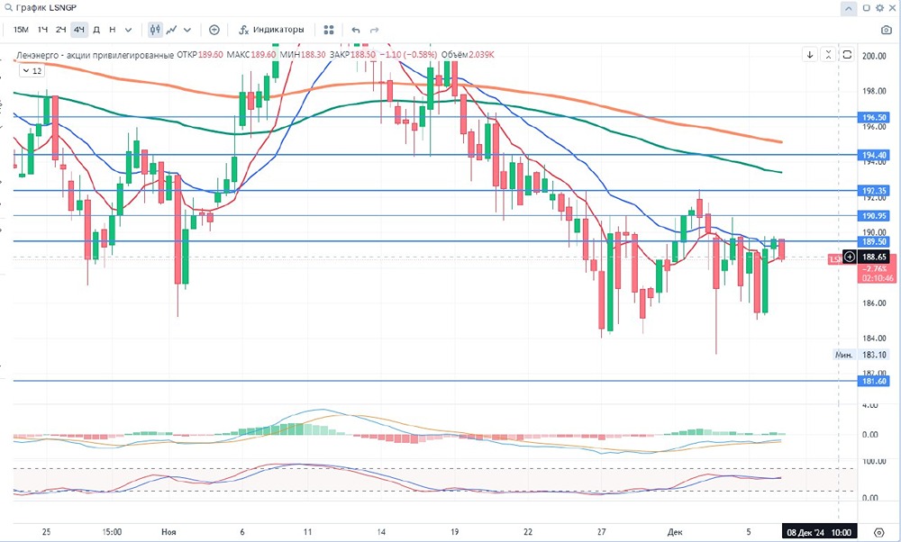 Добрый день уважаемые дамы и господа, инвесторы и трейдеры! ПАО «Россети Ленэнерго» – одна из крупнейших и старейшая распределительная сетевая компания страны. С 2005 года, в результате реформы энергетической отрасли, основными функциями «Россети Ленэнерго» являются передача электрической энергии по сетям 110-0,4 кВ, а также присоединение потребителей к электрическим сетям на территории Санкт-Петербурга и Ленинградской области. «Ленэнерго» ставит перед собой две генеральные цели: надежное, качественное энергоснабжение потребителей и оперативное, недискриминационное технологическое присоединение к сетям. Позитив: 1. Рост чистой прибыли и выручки у компании Ленэнерго за 9 месяцев 2024 2. Выкуп облигаций Россети на сумму 74,3 млн рублей может сигнализировать о финансовой устойчивости компании 3. Выплачивает дивиденды, DSI >0.5 4. Низкая долговая нагрузка Негатив: 1. Рентабельность капитала ниже рынка 2. Доходность за последний год ниже средней доходности за 5 лет Дополнительно: 1. Чистая прибыль «Россети Ленэнерго» по РСБУ за 9 месяцев 2024 года составила ₽26 млрд, увеличившись на 36,1% по сравнению с ₽19,1 млрд в предыдущем году. Это может быть обусловлено ростом выручки по основным видам деятельности и низком темпе роста себестоимости оказанных услуг. 2. Выручка выросла на 13,6% до ₽88,4 млрд против ₽77,8 млрд годом ранее. 3. EBITDA увеличилась на 26,3% г/г — до 47,9 млрд руб. Дивиденды: Согласно Уставу Россети Ленэнерго общая сумма, выплачиваемая в качестве дивиденда по каждой привилегированной акции, устанавливается в размере 10% чистой прибыли по РСБУ. Дивиденд по префам не может быть меньше дивиденда по обыкновенным акциям. Дивидендная политика Россети Ленэнерго (как и других дочек Россетей) предусматривает выплаты по всем типам акций (пропорционально долям в уставном капитале) в 50% чистой прибыли, определенной как максимум из отчетностей РСБУ и МСФО. При этом такая чистая прибыль может корректироваться на обязательные отчисления, инвестиции из чистой прибыли, погашение убытков прошлых лет. 💴 - $LSNGP : ФА Капитализация - 178.1 млрд ₽ Кол-во акций ао– 8524.0 млн Кол-во акций ап– 93.3 млн Р/Е - 8.93 P/S - 1.64 P/BV - 0.97 ROE - 10.9% EV/EBITDA - 2.96 DSI 0.57 ⏰ - ТФ 1 DAY 🛠 ТА - скользящие, стохастик, объем, МАСD, уровни. 📈- тренд вниз ‼- Гистограмма MACD в отрицательных значениях, линии MACD находятся в отрицательных значениях. Стохастик пытается выйти из зоны перепроданности. 20 августа цена пересекла сверху вниз 100 ЕМА и показывает нисходящую тенденцию. При закрытии дня выше 191.97 возможен разворот в лонг. Закрытие цены ниже 185,15 грозит походом до 181-179,5. ⏰ -ТФ 4 часа 🛠 ТА - скользящие, стохастик, объем, МАСD, уровни. 📈- тренд вверх ‼ - Гистограмма MACD в положительных значениях, линии MACD находятся в отрицательных значениях. Стохастик находится выше средней линии. При закрытии ниже 187,95 возможен разворот в шорт. За 6 (06.24-11.24) месяцев цена снизилась более чем на 15 % . Мин. Рrice = 180.01 Мах. Рrice = 234.00 📌 Цены смены тренда указаны в соответствии с ТФ и являются ориентировочными и со временем смещаются.📌 Вторая часть будет опубликована завтра после 13 мск. Мои каналы: БКС https://s.bcs.ru/hua6D Телега https://t.me/ua1cec_trading Дзен https://dzen.ru/ua1cec_trade?share_to=link 🃏Всем профита и до скорой встречи!🃏
