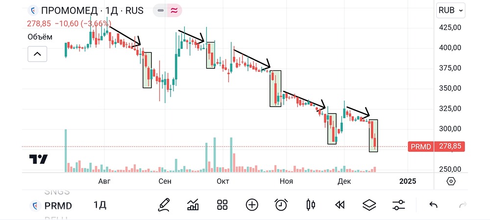 🐹Промомед. #PRMD 🥜Эту бумагу хотел и хочу под среднесрок и про это говорил ещё с ipo, но считал что дорого и вот она уже 278р. и это уже гораздо интереснее))). 🥜Так же это вполне боевая бумага для спекуляций, валотильность присутствует и тут успех определяется точкой входа и если речь о лонге, то это не просто там где превалирует движение вниз. 🥜Ну а теперь о том, что я нарыл интересненького и как это можно использовать в спекулятивных целях. - Первое. На сползаниции цены бумагу брать нельзя! Все сползания заканчивались ускорением. И самый прикол, не как попало, а двумя аномальными свечами. И ладно бы это было пару раз, ну да случайность. Но пять раз случайностью не назовёшь!!! Жаль, что повторение приходится на эту неделю и от этого становится стрёмно(((. - Второе. Для подстраховки после двух аномальных свечей нужна мелкая растущая или формирование растущей. Не хорошо спекулировать и экспериментировать с закрытыми глазами. - И третье. Заканчивается это дело или локальной стабилизацией, которая даёт шанс чутка подзаработать. Или же импульсом, который даёт по больше подзаработать. Или же волной роста, которая даёт хорошо подзаработать. 🥜Таким образом вы теперь знаете лучшие спекулятивные точки входа в бумагу, которые проявили себя за всю не продолжительную жизнь этой бумаги! Не забывайте перестраховываться растущей свечой. Ну и при желании по такой цене можно уже использовать и вилочку! 🥜А я уже в предвкушении, что будет дальше. Обожаю такие моменты и разного рода закономерности. Надеюсь сейчас она не сломается! ❗️Не является индивидуальной инвестиционной рекомендацией. _________________________ 🐹Хомяк в Телеграм: https://t.me/+Kgh36Hk6zQ4yN2Ni 🐹Сканер волатильности акций от Хомяка: https://t.me/HunterMoexBot?start=khomyak