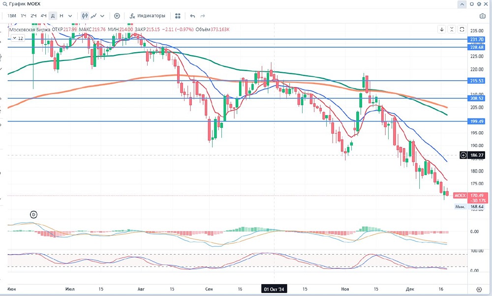 Добрый день уважаемые дамы и господа, инвесторы и трейдеры! 🚨Группа "Московская Биржа" включает в себя ПАО Московская биржа, которое управляет единственной в России многофункциональной биржевой площадкой по торговле акциями, облигациями, производными инструментами, валютой, инструментами денежного рынка и товарами. В состав Группы также входит центральный депозитарий (НКО АО "Национальный расчетный депозитарий"), а также клиринговый центр (НКО НКЦ (АО), выполняющий функции центрального контрагента на рынках, что позволяет Московской бирже оказывать клиентам полный цикл торговых и пост-трейдинговых услуг. ✅Позитив: 📍1. Мосбиржа разработала стандарты проведения IPO для российских компаний с целью повышения дисциплины эмитентов и доверия инвесторов к рынку. 📍2. Обсуждение создания деривативов на инструменты долгового рынка 📍3. Увеличение числа частных инвесторов на Мосбирже 📍4. Высокая КС выгодна для MOEX 📍5. Растущая популярность платформы "Финуслуги" ⛔Негатив: 📍1. Возросшие операционные расходы 📢Дополнительно: 🥇1. Чистая прибыль MOEX Group по МСФО за 9 месяцев 2024 года составила ₽61,88 млрд, увеличившись на 51,9% по сравнению с ₽40,724 млрд. 🥈2. Комиссионные доходы увеличились на 23,9% до ₽44,937 млрд против ₽36,258 млрд годом ранее. 🥉3. Операционные расходы за III кв выросли на 54% 💵Дивиденды: Дивидендная политика Московской биржи (утв. сентябрь 2023): целевой уровень доли прибыли, направляемой на выплату дивидендов, определяется как величина свободного денежного потока на собственный капитал. Минимальное значение уровня доли прибыли, направляемой на выплату дивидендов, составляет 50% от чистой прибыли по МСФО. 💴 - $MOEX : ФА Капитализация - 430.5 млрд ₽ Кол-во акций ао– 2276.0 млн Кол-во акций ап– 0.0 млн Р/Е = 7.08 P/S = 4.11 P/BV = 2.26 ROE = 27.3% EV/EBITDA = 3.55 Net debt/EBITDA = -1,69 DSI 0.36 ⏰ - ТФ 1 DAY 🛠 ТА - скользящие, стохастик, объем, МАСD, уровни. 📈- тренд вниз ‼- Гистограмма MACD в отрицательных значениях, линии MACD находятся в отрицательных значениях. Стохастик находится в зоне перепроданности. 13 авгучста цена пересекла сверху вниз 100 ЕМА и показывает нисходящую тенденцию. При закрытии дня выше 184,89 возможен разворот в лонг. На дневке решили нарисовать что-то похожее на отскок, уровни выше которых не плохо бы закрепиться это 176.01 и 178.3 ⏰ -ТФ 4 часа 🛠 ТА - скользящие, стохастик, объем, МАСD, уровни. 📈- тренд вниз ‼ - Гистограмма MACD в отрицательных значениях, линии MACD находятся в отрицательных значениях. Стохастик находится в зоне перепроданности. При закрытии выше 174,34 возможен разворот в лонг. 📊За 6 (06.24-11.24) месяцев цена снизилась более чем на 22 % . Мин. Рrice = 181.2 Мах. Рrice = 252.68 📌 Цены смены тренда указаны в соответствии с ТФ и являются ориентировочными и со временем смещаются.📌 🃏Всем профита и до скорой встречи!🃏