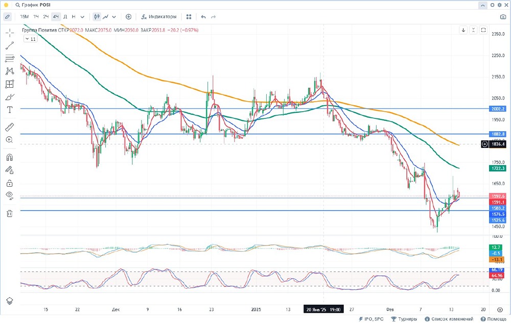 Добрый день уважаемые дамы и господа, инвесторы и трейдеры! 🚨ПАО Группа Позитив ( Positive Technologies) -российский разработчик решений в области кибербезопасности. Positive Technologies уже почти 20 лет создает инновационные решения в сфере информационной безопасности. Продукты и сервисы компании позволяют выявлять, верифицировать и нейтрализовать реальные бизнес-риски, которые могут возникать в IT-инфраструктуре предприятий. Технологии Positive Technologies построены на многолетнем исследовательском опыте и экспертизе ведущих специалистов по кибербезопасности. ✅Позитив: 📍1. Менеджмент компании ожидает, что объем отгрузок за 2024 год составит от 30 до 36 млрд рублей 📍2. Российский рынок информационной безопасности ожидается вырастет почти в три раза к 2028 году 📍3. Сектор кибербезопасности растет хорошими темпами. Результаты компании опережают рынок 📍4. Распределение акций в рамках программы стимулирования роста капитализации 📍5. Рост индустрии ИБ ожидается в пределах 20-25% до 2030г. ⛔Негатив: 📍1. Доходность акции за последний год ниже чем средняя по сектору 📍2. Ожидаемая дивидендная доходность ниже рынка 📍3. Рост долга из-за высокой КС 📍4. Зависимость от госзаказов 📢Дополнительно: 🥇1.Убыток Positive Technologies по МСФО за 9 месяцев 2024 года составил ₽9,1 млрд . 🥈2. Выручка увеличилась на 16,3% до ₽9,72 млрд против ₽8,36 млрд годом ранее. 🥉3. Positive Technologies приняли решение разместить 5,214 млн дополнительных акций компании по закрытой подписке в пользу дочерней АО «Позитив Текнолоджиз» для реализации программы мотивации сотрудников. 💵Дивиденды: Согласно новой дивидендной политике Группы Позитив на выплату дивидендов будет направляться от 50% до 100% управленческой чистой прибыли (NIC). При определении доли NIC Совет директоров будет принимать во внимание поддержание оптимального значения показателя Чистый долг/EBITDA LTM, но в любом случае данный показатель не должен превышать 2,5. 💴 - $POSI : ФА Капитализация - 103.5 млрд ₽ Кол-во акций ао– 66.0 млн Кол-во акций ап– 0.0 млн Р/Е - 24.3 P/S - 4.4 P/BV - 4.91 ROE - 73.5% EV/EBITDA - 19.3 DSI = 0.43 💡Данные взяты из официальных и публичных источников и отражают состояние LTM, а не на момент публикации поста. ⏰ - ТФ 1 DAY 🛠 ТА - скользящие, стохастик, объем, МАСD, уровни. 📈- тренд вниз ‼- Гистограмма MACD в отрицательных значениях, линии MACD находятся в отрицательных значениях. Стохастик находится в зоне перепроданности. 26 июля 2024 цена пересекла сверху вниз 100 ЕМА и показывает нисходящую тенденцию. При закрытии дня выше 1753,0 возможен разворот в лонг. На данный момент пытаемся организовать отскок и закрепиться выше 1585. Пока для дальнейшего роста надо бы закрепиться выше 1661-1688. ⏰ -ТФ 4 часа 🛠 ТА - скользящие, стохастик, объем, МАСD, уровни. 📈- тренд вверх ‼ - Гистограмма MACD вышла в положительные значения, линии MACD находятся в отрицательных значениях. Стохастик находится выше средней линии. При закрытии ниже 1572.9 возможен разворот в шорт. 📊За 6 (08.24-01.25) месяцев цена снизилась более чем на 36 % . Мин. Рrice = 1721,0 Мах. Рrice = 2997.00 📌 Цены смены тренда указаны в соответствии с ТФ и являются ориентировочными и со временем смещаются.📌 🃏Всем профита и до скорой встречи!🃏