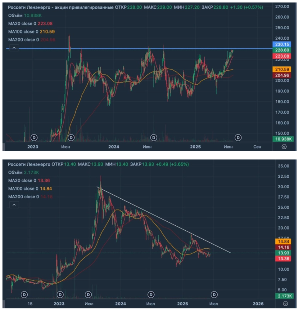 Россети Ленэнерго: ГОСА по дивидендам Сегодня проходит годовое собрание акционеров Россети Ленэнерго — ключевой темой являются дивиденды. Высокая доходность по привилегированным акциям (25,95 ₽), умеренная по обычке (0,4281 ₽). Сейчас мы наблюдаем классический кейс: высокая дивидендная доходность по привилегированным акциям — это сигнал стабильной прибыли у компании как у крупного инфраструктурного держателя. + автоматизация и цифровизая помогают снизить риск отказов, быстрее реагировать на аварии и оптимизировать затраты. Это долгосрочная стратегия, хотя и требует капитала и времени. Акции $LSNGP чувствуют себя отлично и выглядят намного лучше рынка - на это указывает и стабильно восходящий тренд, который мы наблюдаем в привилегированных акциях. Сейчас цена подошла к сопротивлению 230 рублей и стоит быть чуть внимательнее. В то же время $LSNG выглядят не так хорошо - тут нисходящий тренд с сентября 2023 года. До пробоя 17 рублей среднесрочно тут не стоит думать о покупках - слишком много рисков после небольшого отскока пойти дальше вниз. Источник: https://t.me/+-a0sqZD702Y5MDQy