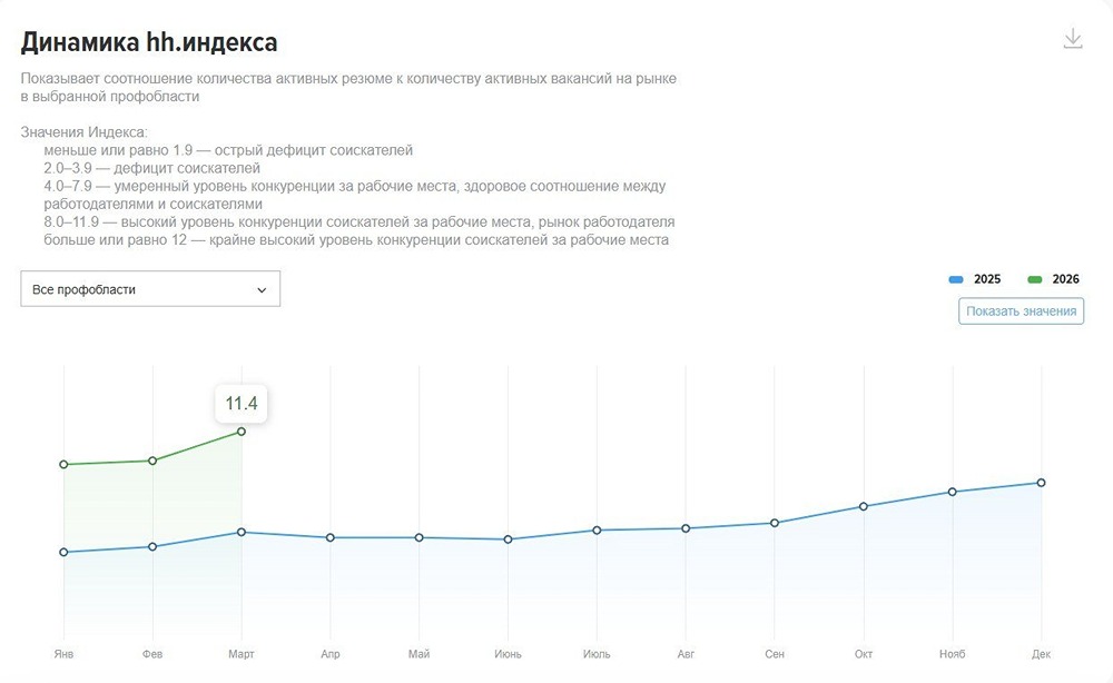 😳 Безработица: Росстат рапортует о рекорде, а hh.индекс бьёт антирекорды. Или о парадоксах макроэкономики ✅Росстат бодро рапортует: в феврале безработица обновила минимум – 2,1%. Всего 1,6 млн официально безработных. Отличный показатель? Не спешите так думать. ❌HeadHunter за март выдал hh.индекс (резюме/вакансии) – 11,4, свидетельствующий о …росте безработице. И это худший показатель за всю историю. Год назад было около 4–5. Что происходит? 😳 Объяснение простое, и оно не требует теорий заговора. У Росстата и HH разная не только методология, но и сама логика расчётов. 👉Росстат считает безработными только тех, кто не имеет работы, активно её ищет и готов приступить. При этом он опрашивает домохозяйства, а не берёт данные из центров занятости. Но главный нюанс: многие люди, потерявшие работу, перестают активно искать (отчаялись, живут на сбережения, ушли в неформальную занятость). Официальная статистика их уже не учитывает. ‼️Кроме того, часть людей уходят добровольцами на СВО – сколько именно, никто нам не скажет, но отток трудовых ресурсов явный. Эти люди не работают в реальной экономике, но официально числятся работающими. 👥HeadHunter же фиксирует реальную активность: люди массово создают резюме, рассылают отклики. Их в марте стало на 41% больше, чем год назад. А вот вакансий – на 27% меньше. Работодатели сокращают найм. Это признаки скрытой безработицы и стагнации рынка труда. 🔽Зарплаты тоже перестали расти: предлагаемая снизилась на 6% с пика сентября 2025 года. Ожидания соискателей, наоборот, выросли. Разрыв увеличивается. Вывод: парадокса нет 🤷♂️ Росстат показывает «остаточную» безработицу среди тех, кто ещё не сдался. HeadHunter – реальный накал на рынке труда: работы мало, желающих много, зарплаты падают. Это не стандартный «кадровый голод», как нас пытаются уверить, а очень жёсткий структурный дисбаланс. Который искажает картину и не даёт правительству действовать правильно. Подписывайтесь на мои соц.сети, будем вместе достигать успехов: 🔵 [мой канал в Telegram](https://t.me/+yOj3orBJRVgxMTVk) 〽️ [мой канал в Mondiara](https://i.mondiara.com/i/c/Vladimir_stocks) 🟠 [мой блог на Smart-lab](https://smart-lab.ru/my/Vladimirnabirzhe/)
