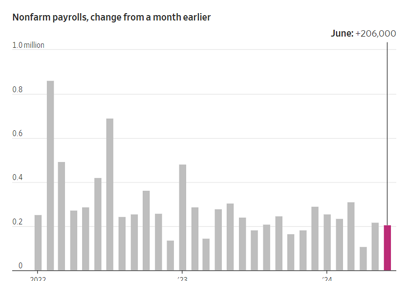 Аргументы в пользу снижения ставки в сентябре строятся на более медленных данных по занятости Министерство труда сообщило в пятницу, что в США в прошлом месяце было создано 206 000 рабочих мест, что немного превзошло ожидания и продолжило удивительно уверенный рост. Но уровень безработицы вырос до 4,1%, что является признаком слабости на рынке труда, который уже продемонстрировал некоторые признаки постепенного замедления. Были и другие признаки того, что рынок труда продолжает охлаждаться. Средняя почасовая заработная плата выросла на 3,9% в июне по сравнению с годом ранее, что стало наименьшим приростом с 2021 года. Данные за апрель и май были пересмотрены в сторону понижения на 111 000 рабочих мест в совокупности. Уровень участия в рабочей силе, доля людей трудоспособного возраста, которые были трудоустроены или искали работу, выросла до 62,6%, что свидетельствует о том, что на рынок труда вышло больше людей. Отчет о занятости, похоже, подтвердил мнение инвесторов о том, что экономика замедляется, но не настолько радикально, чтобы вызвать более агрессивное снижение ставок. Для кампании по переизбранию президента Байдена продолжающийся рост числа рабочих мест считается положительным моментом, но рост уровня безработицы лишает его ценной темы для обсуждения. В июньском отчете впервые с 2021 года отмечено, что уровень безработицы превысил 4%. Пятничный отчет Федеральной резервной системы является еще одним доказательством того, что рынок труда, похоже, пришел к лучшему балансу. Горячий рынок труда затрудняет снижение ставок, в то время как центральный банк также обязан поддерживать рынок труда как можно более сильным, не вызывая инфляции. Вероятно, в пятничном отчете по заработной плате не было ничего достаточно тревожного, чтобы побудить чиновников ФРС настаивать на снижении ставки в июле. Но в конечном итоге некоторые чиновники ФРС скажут, что риски дальнейшего ослабления рынка труда нежелательны, даже если другие могут утверждать, что инфляция по-прежнему не демонстрирует достаточного прогресса для снижения ставок. В то время как июль может быть слишком ранним для снижения ставки, слабый отчет по инфляции на следующей неделе может привести к тому, что "голуби" из ФРС, которые больше обеспокоены слабостью рынка труда, заявят, что центральному банку пора ускорить снижение ставки в сентябре. Один из рисков заключается в том, что, как показал опыт, рынок труда может быстро перейти от сильного состояния к слабому. Хотя уровень безработицы в 4,1% по-прежнему исторически низок, он вырос с 3,4% в начале прошлого года. Правило Сахма, эмпирическое правило, популяризированное экономистом Клаудией Сахм, гласит, что если средний уровень безработицы за три месяца вырастет на полпроцента или более выше самого низкого трехмесячного показателя за предыдущий год, экономика находится в рецессии. За последние три месяца уровень безработицы в среднем составлял 4% -0,4 процентных пункта, что выше трехмесячного минимума в 3,6% за последний год. Высокие процентные ставки требуют времени, чтобы полностью внедриться в экономику, но в последнее время они более явно сдерживают активность. Несмотря на то, что заработная плата росла быстрее цен, рост потребительских расходов замедлился. “Признаки напряженности продолжают появляться среди потребителей с доходам