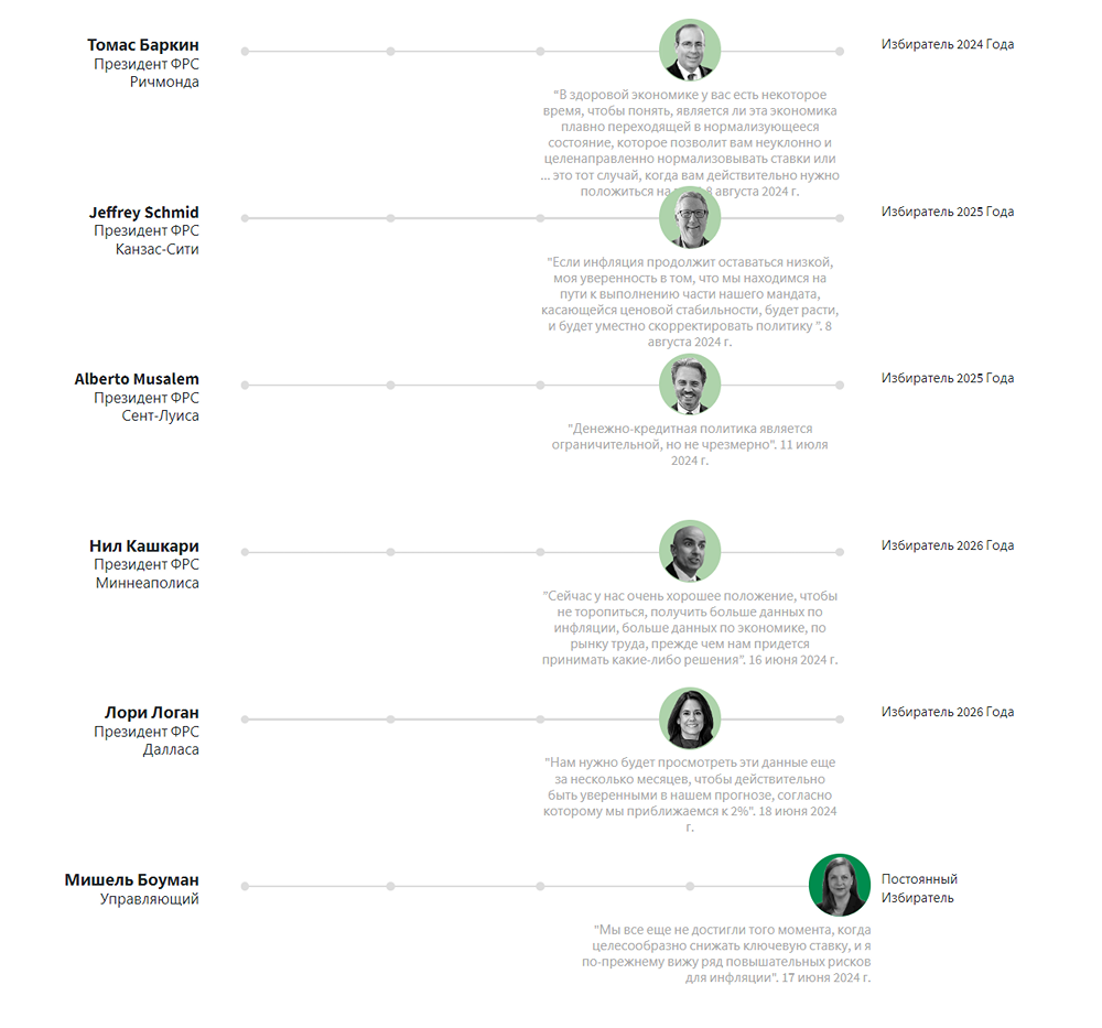 Новость: нейтральная. Голуби и ястребы. Что говорят руководители ФРС США о процентных ставках. Центральные банки США сохранили свой целевой показатель стоимости краткосрочных заимствований в диапазоне 5,25% -5,50% с июля прошлого года, когда они завершили кампанию по повышению ставок на 2022-2023 годы для борьбы с резким ростом цен, поскольку мировая экономика оправилась от рецессии, вызванной пандемией COVID-19. С тех пор инфляция и рынок труда заметно снизились, и председатель ФРС Джером Пауэлл говорит, что политики считают, что приближается время для снижения ключевой ставки. Когда и на сколько - предмет интенсивных спекуляций. Руководители ФРС говорят, что решение будет принято на основе экономических данных. Оно также, несомненно, будет определяться конкурирующими мнениями среди политиков по поводу того, как интерпретировать эти данные. Вот обзор последних комментариев руководителей ФРС, сгруппированных под названиями “голубь” и “ястреб" в качестве приблизительного обозначения их пристрастий к денежно-кредитной политике. Голубь больше сосредоточен на рисках для рынка труда, в то время как ястреб больше сосредоточен на угрозе инфляции. Авторы: Ann Saphir, Howard Schneider