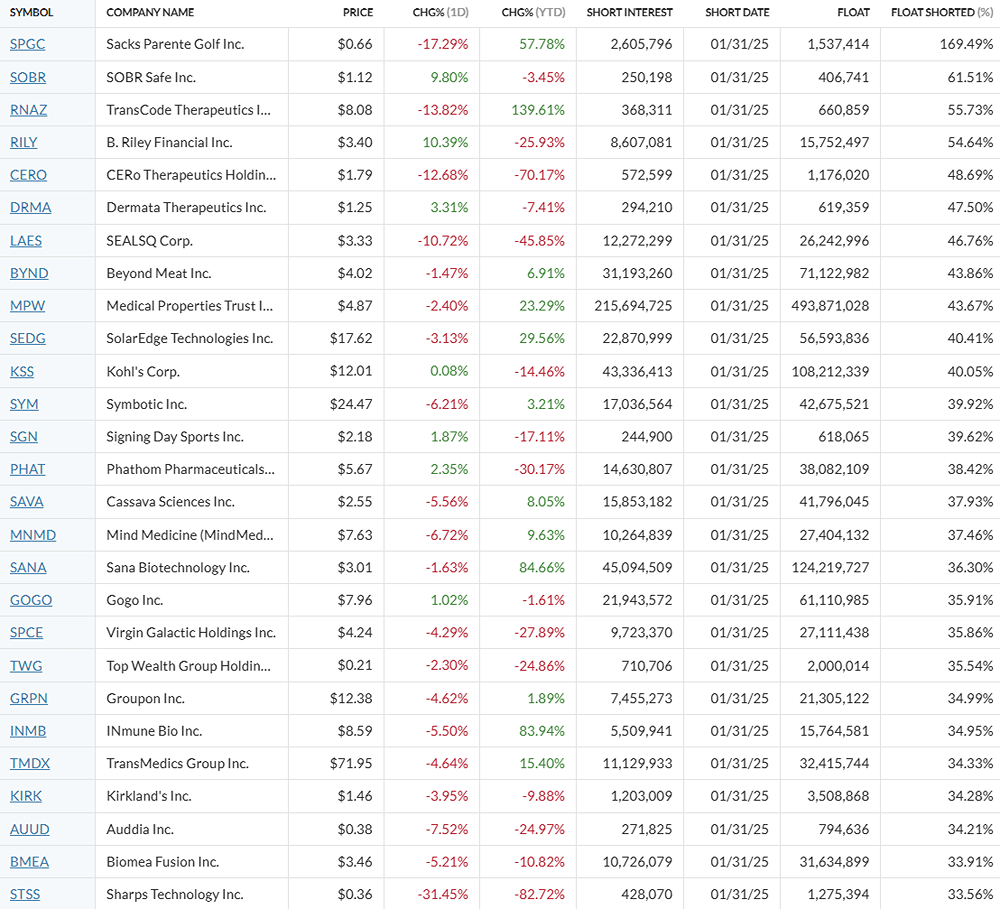 Short Flow акций США на 24.02 Уровень short flow — это процент акций компании, проданных в шорт относительно общего числа акций в обращении. Высокий уровень (обычно выше 10%) указывает на негативные ожидания инвесторов, тогда как низкий уровень свидетельствует о доверии к компании. Источник: www.marketwatch.com