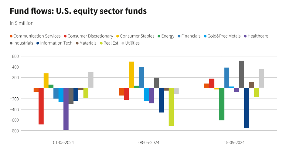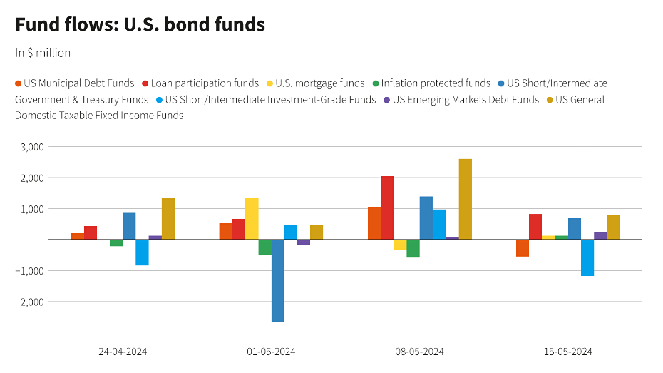 Новость: положительная. Фонды акций США получают самый большой еженедельный приток за восемь недель. Фонды акций США привлекли значительный приток средств за семь дней до 15 мая, чему способствовали ожидания снижения ставки Федеральной резервной системой после слабых данных по занятости в США и более слабого, чем ожидалось, показателя инфляции. Инвесторы вложили в фонды акций США чистые 5,78 миллиарда долларов, что является максимальным показателем за неделю с 20 марта, показали данные LSEG. Опубликованный в среду отчет, показывающий замедление потребительских цен в США, усилил ожидания рынка двух снижений ставок к концу года. Однако с тех пор оптимизм снова пошел на убыль, поскольку последние данные по занятости в четверг отражают все еще довольно напряженный рынок труда. Фонды с крупной капитализацией США привлекли около $ 5,38 млрд, что является крупнейшим чистым еженедельным притоком с 27 марта. Фонды с несколькими капитализациями привлекли около $ 1,05 млрд, но чистый отток средств фондов со средней и малой капитализацией составил $ 817 млн и $ 191 млн соответственно. Отраслевые фонды акций получили всего 22 миллиона долларов после шести еженедельных чистых оттоков подряд. Промышленные, финансовые и коммунальные предприятия привлекли 515 миллионов долларов, 385 миллионов долларов и 359 миллионов долларов соответственно. В технологическом секторе чистые продажи составили около 757 миллионов долларов. Фонды облигаций США привлекали приток средств четвертую неделю подряд, увеличив чистый приток примерно на 2,39 миллиарда долларов. Инвесторы направили чистые 815 миллионов долларов в фонды участия в займах США, 812 миллионов долларов в общие внутренние облагаемые налогом фонды с фиксированным доходом и 698 миллионов долларов в краткосрочные / промежуточные государственные и казначейские фонды. Однако фонды краткосрочного / промежуточного инвестиционного уровня США пережили значительный спад: чистый отток составил 1,18 миллиарда долларов, что стало самым большим оттоком с 8 ноября 2023 года. Фонды денежного рынка привлекли чистые 2,56 миллиарда долларов, что является наименьшим притоком за последний месяц. Авторы: Gaurav Dogra, Patturaja Murugaboopathy Источник: www.reuters.com