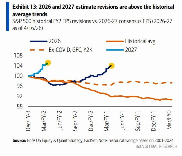 Аналитики продолжают активно повышать свои прогнозы по отчётностям компаний из S&P 500 на 2026–2027 гг. Прогнозы повышаются намного быстрее исторического среднего — BofA.