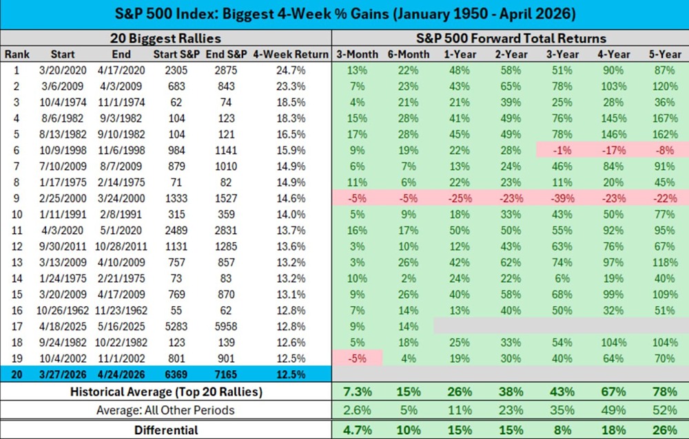 Рост S&P 500 на 12,5% за последние 4 недели стал 20-м по величине 4-недельным приростом для этого индекса с 1950 года.