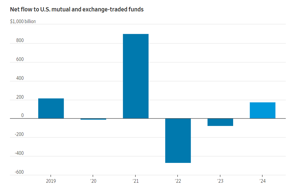 Новость: положительная. Оптимистичные инвесторы вкладывают средства в фонды акций и облигаций. К настоящему времени взаимные и биржевые фонды, базирующиеся в США, привлекли чистый приток средств в размере 172 миллиардов долларов в этом году, что является заметным изменением после того, как они коллективно выводили активы в течение каждого из последних двух лет. Приток инвестиций знаменует отказ от неприятия риска, которое инвесторы демонстрировали на протяжении большей части последних двух лет, и принятие тезиса о том, что сильная экономика США поддержит финансовые рынки. Активы в фондах денежного рынка и других продуктах, похожих на наличные, которым инвесторы отдавали предпочтение в прошлом году, достигли плато. Вместо этого инвесторы вкладывают свои деньги в акции и облигации. “Экономика в хорошей форме, рынки труда в хорошей форме, и центральные банки по всему миру, похоже, готовы оказать поддержку”, - сказал Майкл Ароун, главный инвестиционный стратег State Street Global Advisors. “Это привлекательный фон для инвестирования, и это основная причина, по которой вы наблюдаете повышенный аппетит ко всему”. Приток средств в фонды акций и облигаций США в этом году самый сильный с 2021 года, когда процентные ставки были близки к нулю. Согласно данным ETFGI, чистый объем инвестиций в ETF в апреле в глобальном масштабе составил 468 миллиардов долларов, что является рекордным показателем за всю историю. Торговля с мягкой посадкой, похоже, полностью вернулась в моду после того, как несколько месяцев горячие данные по инфляции пошатнули доверие инвесторов. Последние данные по потребительским ценам оказались ниже прогноза, а результаты за первый квартал показали стремительный рост корпоративной прибыли. Индекс S & P 500 вырос на 11% в 2024 году, торгуясь чуть ниже своего рекорда. Скептики утверждают, что стоимость акций выглядит дорогой, а дополнительная доходность, которую предлагают рискованные корпоративные долги, исторически низка. По данным Morgan Stanley, курс S & P 500 по сравнению с ожидаемой прибылью в течение следующих 12 месяцев в настоящее время находится в верхней децили своего исторического диапазона. На этой неделе трейдеры будут внимательно следить за пятничным выпуском индекса расходов на личное потребление, предпочтительного индикатора инфляции Федеральной резервной системы. В настоящее время рынки, похоже, оптимистично оценивают экономические перспективы, но высокие показатели инфляции могут поставить под сомнение их надежды на снижение ставок. Уолл-стрит в настоящее время рассчитывает по крайней мере на одно снижение процентной ставки позже в этом году, хотя протоколы последнего заседания ФРС показали, что чиновники центрального банка все еще обеспокоены сохраняющейся инфляцией. Если более мягкая денежно-кредитная политика, которую ожидают инвесторы, не материализуется, ралли фондового рынка, скорее всего, прекратится, предупреждают аналитики. Инвесторы выглядят как угодно, только не защищающимися. Из 10 ETF, которые собрали больше всего денег в этом году, только один является фондом облигаций. Два отслеживают цену биткоина. Лидер, Vanguard S & P 500 ETF, набирает обороты уже второй год подряд. Инвесторы добавили чистых 37 миллиардов долларов менее чем за пять месяцев; годовой рекорд притока средств в ETF составляет 50 миллиардов долларов. Склонно