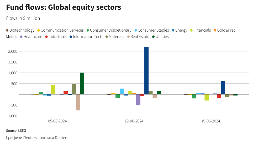 Новость: негативная. Мировые фонды акций наблюдают отток средств вторую неделю подряд. Мировые фонды акций вторую неделю подряд сталкиваются с оттоком капитала на неделе, закончившейся 19 июня, поскольку инвесторы извлекают выгоду из роста акций на фоне опасений, что ФРС может снизить ставки только один раз в этом году, и сохраняющихся политических рисков в Европе. Согласно данным LSEG, инвесторы вывели из глобальных фондов акций в течение недели чистые 2,61 миллиарда долларов после чистых продаж на сумму около 15,35 миллиарда долларов на предыдущей неделе. На прошлой неделе Федеральная резервная система США сохранила процентные ставки на прежнем уровне, но сократила прогнозируемое снижение ставок на год с трех до одной, заняв более ястребиную позицию, чем ожидалось. Тем временем мировые фондовые индексы выросли, а индекс акций MSCI по всему миру, достигнув нового рекорда в четверг, чему способствовали признаки постепенного охлаждения на рынке труда и замедления инфляции. Фонды акций США понесли чистый отток на сумму 8,37 миллиарда долларов в течение недели после чистых продаж на сумму около 21,54 миллиарда долларов на предыдущей неделе. Однако инвесторы приобрели европейские и азиатские фонды акций примерно на 2,77 миллиарда долларов каждый. Чистые продажи акций отраслевых фондов составили около $ 181 млн, при этом отток средств из финансового и потребительского секторов составил около $290 млн и $195 млн соответственно. И наоборот, технологический сектор обеспечил второй еженедельный приток, составив около 606 миллионов долларов на чистой основе. Тем временем глобальные инвесторы приобрели глобальные фонды облигаций на сумму около 4,82 миллиарда долларов, увеличив чистые покупки 26-ю неделю подряд. Они направили 1,4 миллиарда долларов в фонды корпоративных облигаций, что стало третьей неделей чистых покупок подряд. Кроме того, фонды государственных облигаций привлекли около 963 миллионов долларов притока. Чистые продажи фондов денежного рынка составили $ 5,32 млрд, что стало первым недельным оттоком за последние три. Среди сырьевых фондов инвесторы потеряли драгоценных металлов на сумму 490 миллионов долларов после двух недель чистых покупок подряд. В энергетических фондах также произошел отток на сумму 165 миллионов долларов. Данные по 29 481 фонду развивающихся рынков показали, что отток средств из фондов акций составил 1,76 миллиарда долларов, что стало самым большим оттоком за неделю с 24 апреля. В фондах облигаций также зафиксирован незначительный чистый отток средств на сумму 96 миллионов долларов. Авторы: Gaurav Dogra, Patturaja Murugaboopathy Источник: www.reuters.com