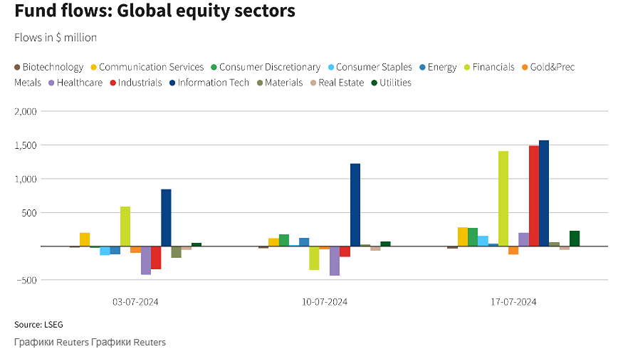 Новость: положительная. Глобальные фонды акций получают четвертый еженедельный приток на фоне ставок на снижение ставок. Глобальные фонды акций привлекают приток средств четвертую неделю подряд за семь дней до 17 июля, подстегиваемые ожиданиями снижения ставки Федеральной резервной системы после того, как последние данные показали замедление инфляции, что подстегнуло ралли на фондовом рынке. Согласно данным LSEG, за неделю инвесторы приобрели глобальные фонды акций на сумму 26,51 миллиарда долларов, что стало крупнейшей еженедельной чистой покупкой с февраля 2022 года. Глобальный фондовый индекс MSCI (MIWD00000PUS) достиг рекордного уровня 832,35 в прошлую пятницу после отчета по инфляции, который указал на 0,1% снижение потребительских цен в США за июнь, укрепив ожидания рынка относительно предстоящего снижения ставки ФРС. Мировые фондовые индексы, однако, упали примерно на 1,3% на этой неделе из-за распродажи в технологическом секторе на фоне эскалации китайско-американской торговой напряженности. По регионам инвесторы вложили в фонды акций США 21,7 миллиарда долларов, что является наибольшим объемом с февраля 2021 года. Европейские и азиатские фонды привлекли приток средств на сумму 2,2 миллиарда долларов и 2,03 миллиарда долларов соответственно. В технологическом, промышленном и финансовом секторах наблюдался повышенный спрос, поскольку они получили приток средств в размере $ 1,57 млрд, $ 1,49 млрд и $ 1,4 млрд соответственно. Глобальные фонды облигаций, тем временем, остаются популярными 30-ю неделю подряд, поскольку за неделю они обеспечили приток средств в размере $ 15,84 млрд. Фонды корпоративных облигаций получили заметный приток в размере 3,38 миллиарда долларов, седьмой еженедельный приток подряд. Государственные фонды и фонды участия в займах также совершили чистые покупки на сумму 2,16 миллиарда долларов и 1,45 миллиарда долларов соответственно. Инвесторы также купили фонды денежного рынка на сумму около 3,18 миллиарда долларов, увеличив еженедельный приток средств на третью неделю. В сырьевом сегменте фонды драгоценных металлов совершили чистые покупки на 1,06 миллиарда долларов, что является максимальным показателем за неделю с 20 марта. Приток средств в энергетические фонды составил около 51 миллиона долларов. Данные, охватывающие 29 555 фондов развивающихся рынков, показали, что инвесторы вывели средства в фонды акций на сумму около 1 миллиарда долларов, нарушив трехнедельную тенденцию покупок. Тем временем фонды облигаций пережили шестой еженедельный отток подряд, составив 1,8 миллиарда долларов в чистом выражении. Авторы: Gaurav Dogra, Patturaja Murugaboopathy Источник: www.reuters.com
