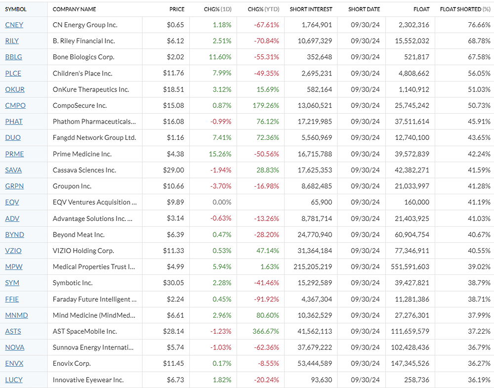 Short Flow акций США на 21.10. Уровень short flow — это процент акций компании, проданных в шорт относительно общего числа акций в обращении. Высокий уровень (обычно выше 10%) указывает на негативные ожидания инвесторов, тогда как низкий уровень свидетельствует о доверии к компании. Источник: www.marketwatch.com