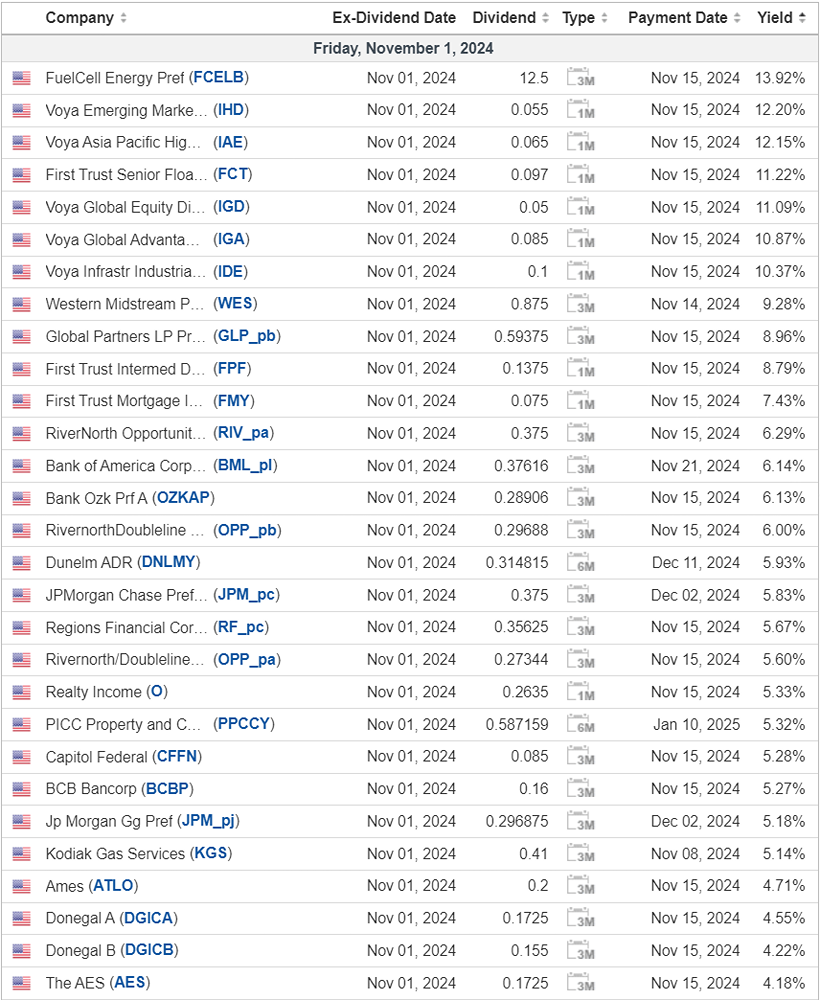 Календарь дивидендных выплат в США на 01 ноября Ex-dividend date - крайний срок покупки ценной бумаги для участия в дивидендной выплате Payment Date - дата выплаты дивидендов эмитентом ценной бумаги Yield - процентная ставка по дивидендной выплате в годовом выражении. Источник: www.investing.com