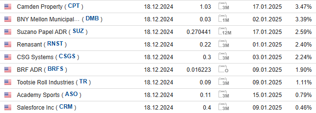 Календарь дивидендных выплат в США на 18 декабря Ex-dividend date - крайний срок покупки ценной бумаги для участия в дивидендной выплате Payment Date - дата выплаты дивидендов эмитентом ценной бумаги Yield - процентная ставка по дивидендной выплате в годовом выражении. Источник: www.investing.com