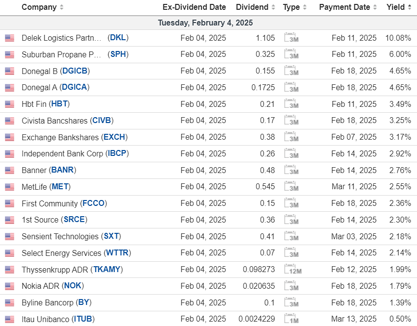 Календарь дивидендных выплат в США на 04 февраля Ex-dividend date - крайний срок покупки ценной бумаги для участия в дивидендной выплате Payment Date - дата выплаты дивидендов эмитентом ценной бумаги Yield - процентная ставка по дивидендной выплате в годовом выражении. Источник: www.investing.com
