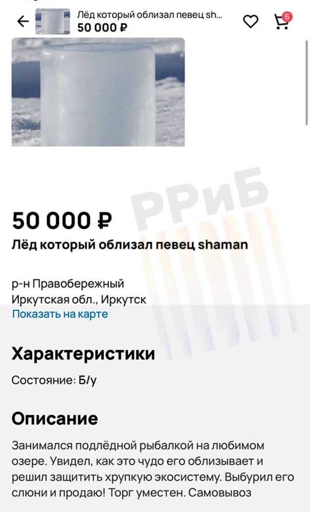 Лёд, который облизал SHAMAN, продают за 50 тысяч рублей. Темщики из Иркутска опубликовали объявление о продаже того самого куска с Байкала. Продавец уверяет, что на нём остались слюни артиста. «Занимался подлёдной рыбалкой на любимом озере. Увидел, как это чудо его облизывает и решил защитить хрупкую экосистему. Вырубил этот кусок льда со слюнями и продаю», — пишет продавец. [mondiara.com](https://mondiara.com) 👆 Больше новостей и анализа [Скачать](https://apps.apple.com/ru/app/m-o-n-d-i-a-r-a/id6475953453) приложение в App Store [Скачать](https://play.google.com/store/apps/details?id=com.mondiara.app) приложение в Google Play Пост взят с международного сервиса для инвесторов и трейдеров [M O N D I A R A](https://i.mondiara.com/)