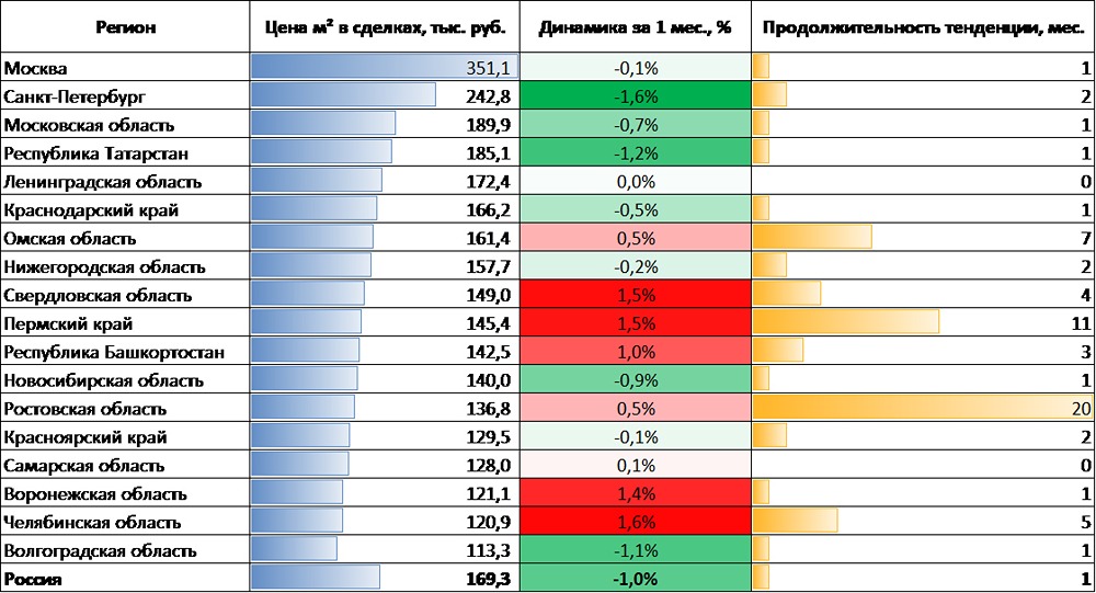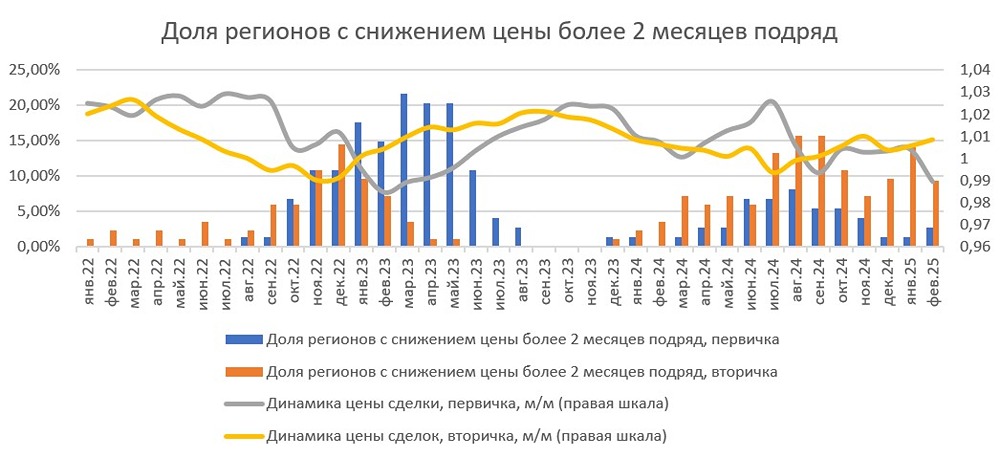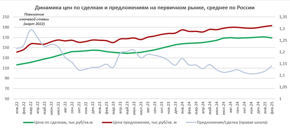 Изменения цен на рынке жилой недвижимости в феврале: исследование Домклик и Центра финансовой аналитики. Согласно данным о заключенных сделках по ипотеке, представленных Сбером, в феврале 2025 года средняя стоимость квадратного метра на первичном рынке жилой недвижимости в России составила 169,3 тыс. руб. Лидеры по стоимости на первичном рынке: -Москва: 351,1 тыс. руб./м², -Санкт-Петербург: 242,8 тыс. руб./м², -Московская область: 189,9 тыс. руб./м², -Республика Татарстан: 185,1 тыс. руб./м², -Ленинградская область: 172,4 тыс. руб./м². Наименьшие цены отмечены в: -Волгоградской (113,3 тыс. руб./м²), -Челябинской (120,9 тыс. руб./м²), -Воронежской (121,1 тыс. руб./м²) и -Самарской областях (128 тыс. руб./м²). Изменения цен на первичном рынке. В феврале наблюдалось снижение средней стоимости квадратного метра на 1% по сравнению с предыдущим месяцем. Это изменение произошло на фоне роста цен в предыдущие месяцы с октября по январь (0,3–0,4% ежемесячно). Наиболее значительное снижение цен: -Санкт-Петербург: -1,6%, -Республика Татарстан: -1,2%, -Волгоградская область: -1,1%. Среди регионов с положительной динамикой цен можно отметить Челябинскую, Свердловскую, Пермскую области, Воронежскую область, а также Омскую и Ростовскую области. Причины снижения цен. Снижение цен связано с низкими темпами продаж у застройщиков, которые семь месяцев подряд не превышают 2% от общего объёма стройки. На фоне высоких расходов застройщиков они не могут компенсировать эту ситуацию повышением цен. Состояние вторичного рынка. Средняя стоимость квадратного метра на вторичном рынке в феврале составила 113,1 тыс. руб. Лидеры по стоимости на вторичном рынке: -Москва: 299,9 тыс. руб./м², -Санкт-Петербург: 202,2 тыс. руб./м², -Московская область: 148,2 тыс. руб./м², -Краснодарский край: 141,4 тыс. руб./м². -Ленинградская область: 128,3 тыс. руб./м². Наименьшие цены были зафиксированы в Челябинской области, Пермском крае и Республике Башкортостан, где стоимость квадратного метра не превышает 80 тыс. руб. Изменения стоимости готовой недвижимости. На вторичном рынке продолжилось медленное увеличение цен: в феврале стоимость квадратного метра выросла на 0,8%. Наиболее заметный рост был отмечен в: -Санкт-Петербурге: +1,7%, -Свердловской области: +1,6%, -Омской области: +1,3%. Однако в Красноярском крае и Новосибирской области наблюдался спад цен: -1,4% и -0,8% соответственно. Прогнозы на будущее. На первичном рынке ожидается дальнейшее снижение цен, обусловленное низким спросом и высокой стоимостью строительства. Разрыв между ценой предложения и сделками продолжает расти, что также указывает на снижающуюся уверенность продавцов. На вторичном рынке, несмотря на незначительный рост цен, различие между ценой предложения и сделками продолжает сокращаться, что создаёт предпосылки для будущего снижения цен. Регионы с исторически высоким объёмом сделок, как, например, столичные и некоторые регионы Поволжья, должны продолжить поддерживать цены, однако остаются области, где цена на недвижимость снижается в условиях падающего спроса. Источник: www.sberbank.ru