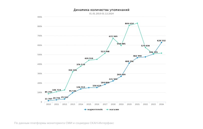 Маркетплейсы обошли розничные магазины по популярности в СМИ. В 2024 году маркетплейсы стали главными героями медиапространства, опередив традиционные магазины по количеству упоминаний. Охваты публикаций достигли рекордных 805 млн, а число упоминаний превысило 1 млн, сообщают эксперты СКАН-Интерфакс. Интерес к онлайн-торговле стабильно растет: с 2020 года число публикаций о маркетплейсах увеличивается на 20–30% ежегодно, а в 2024 году рост составил 40%. В то же время розничные магазины испытывают «медийные качели» — их популярность то растет, то снижается, отражая экономические и социальные тренды последних лет. Лидером среди маркетплейсов в СМИ стал Wildberries, за ним следуют Ozon, Яндекс Маркет, Aliexpress и «Мегамаркет». Источник: www.interfax.ru