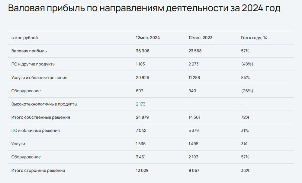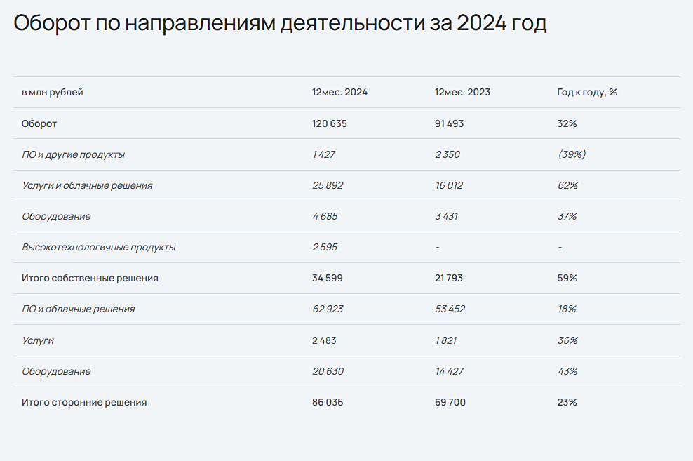 Отчет МСФО за 2024 год. ПАО «Софтлайн» (MOEX: SOFL) представляет аудированные консолидированные результаты за 2024 год, подтверждая значительный рост скорректированной EBITDA на 58% и возможную выплату дивидендов по итогам года. Компания, специализирующаяся на цифровой трансформации и информационной безопасности, достигла оборота в 120,6 млрд рублей, что на 32% больше по сравнению с 2023 годом. Рост был обеспечен в том числе за счет увеличения продаж собственных продуктов, которые составили 29% от общего оборота. Валовая прибыль за год увеличилась на 57%, достигнув 36,9 млрд рублей, а валовая рентабельность составила 30,6%, улучшив показатели на 4,8 п.п. по сравнению с предыдущим годом. Скорректированная EBITDA в 2024 году составила 7,1 млрд рублей, что на 58% больше по сравнению с предыдущим годом, и значительно превысила прогноз. Чистая прибыль компании в отчетном году составила 2,6 млрд рублей. Ожидается, что в 2025 году оборот ПАО «Софтлайн» увеличится до 150 млрд рублей, а валовая прибыль возрастет до 43-50 млрд рублей. Компании предстоит продолжить развитие собственных высокорентабельных решений, включая облачные и сервисные продукты, что окажет дополнительное влияние на рост прибыли. В свою очередь, в 2024 году компания сделала несколько стратегически важных шагов в направлении расширения бизнеса. В частности, была заключена сделка по приобретению контрольного пакета акций в крупном российском производителе волоконных лазеров, что открыло новые перспективы для развития высокотехнологичных продуктов. Источник: www.softline.ru