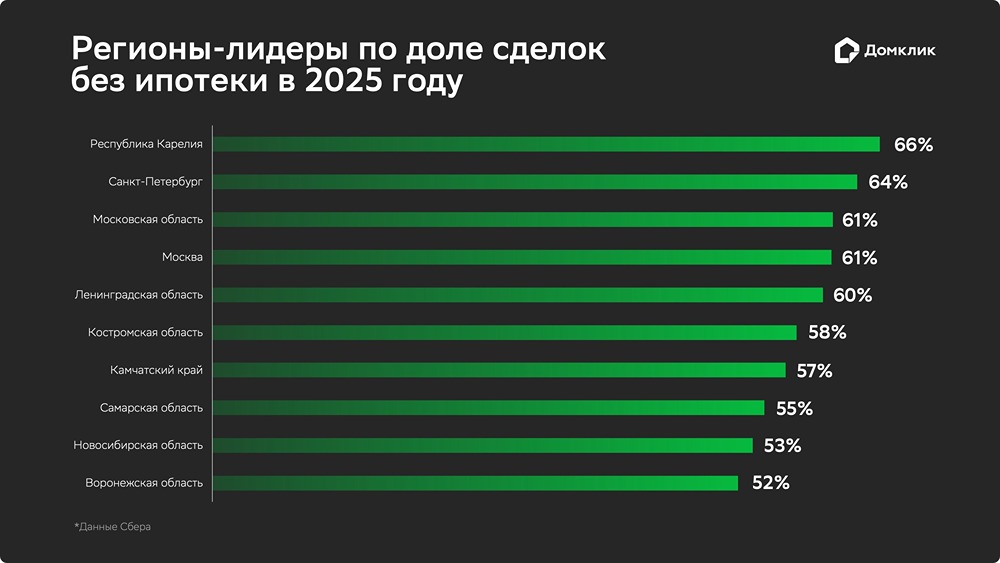 Рост доли неипотечных сделок с недвижимостью в Сбербанке. В июле 2023 года Банк России начал цикл ужесточения денежно-кредитной политики, и ключевая ставка выросла с 7,5% до 8,5%, а к концу года достигла 16%. В 2024 году она продолжала расти и достигла рекордного значения 21% в октябре. Доля сделок с недвижимостью без ипотеки в Сбере выросла с 16% во втором полугодии 2023 года до 55% к началу марта 2025 года. Лидеры по этому показателю: Республика Карелия (66%), Санкт-Петербург (64%), Москва и Московская область (61%). Как менялась доля неипотечных сделок. Во втором полугодии 2023 года доля сделок без ипотеки составляла 16,6%, в первом полугодии 2024 года выросла до 31%, к концу второго полугодия достигла 44%, увеличившись на 13 п.п. В переходный период до начала 2025 года доля сделок без ипотеки выросла ещё на 11 п.п., достигнув 55%. Рост происходил параллельно с повышением ключевой ставки. Где чаще всего заключаются сделки без ипотеки. Лидером по доле сделок без ипотеки стала Республика Карелия (66%), далее следуют Санкт-Петербург (64%), Москва и Московская область (61%), Ленинградская область (60%). В диапазоне от 58% до 52% расположились Костромская область (58%), Камчатский край (57%), Самарская область (55%), Новосибирская область (53%) и Воронежская область (52%). Оформить сделку без ипотеки можно через Домклик. Менеджеры помогут: -проведут проверку недвижимости на юридическую чистоту; -подготовят документы для сделки; -зарегистрируют переход права собственности и переведут деньги продавцу. Оформить сделку можно в офисах Сбера и Домклик по всей России. Записаться на сделку можно онлайн. Методология исследования. Аналитики Домклик изучили сделки без ипотеки с использованием сервисов Домклик (Сервис электронной регистрации, Сервис безопасных расчётов) со второго полугодия 2023 года по февраль 2025 года. Доля сделок без ипотеки была рассчитана для каждого полугодия с 2023 года и начала 2025 года. Регионы с наибольшей долей неипотечных сделок были определены на начало 2025 года. Источник: www.sberbank.ru
