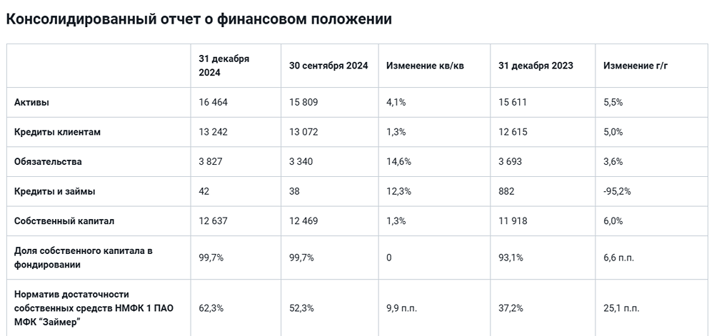 Займер представляет финансовые результаты за IV квартал 2024 года и достижения компании. ПАО МФК «Займер», лидирующая финтех-платформа на российском рынке микрофинансирования, представляет результаты своей финансовой деятельности за IV квартал 2024 года по международным стандартам МСФО. В IV квартале 2024 года компания продемонстрировала следующие ключевые достижения: - Процентные доходы увеличились на 4,8% по сравнению с предыдущим кварталом и на 14,3% в годовом исчислении, что связано с ростом объема предоставленных займов. - Оценочные резервы снизились на 18,4% по сравнению с предыдущим кварталом и на 11,8% за год, благодаря выбору более надежных и незакредитованных заемщиков. - Чистая прибыль составила 1 218 млн руб., что на 16% больше по сравнению с прошлым кварталом и на 42,9% выше, чем в IV квартале 2023 года. - Вопрос размера дивидендов будет обсуждаться на годовом собрании акционеров в мае 2025 года. Компания продолжает развивать гибкую стратегию роста, ориентируясь на трансформацию из монопродуктовой в мультипродуктовую модель. В IV квартале Займер значительно увеличил клиентскую базу, а также начал тестировать новые продукты, что привело к росту маркетинговых затрат. При этом, благодаря эффективному управлению трафиком, оценочные резервы были снижены, что позволило компенсировать эти затраты и повысить чистую прибыль. Займер также обладает высокой финансовой устойчивостью и преимущественно развивает бизнес за счет собственного капитала, что минимизирует зависимость от внешних факторов, таких как состояние долгового рынка и процентные ставки. Недавно компания заключила стратегическое партнерство с Seller Capital, что открыло возможности для роста в сегменте кредитования продавцов на маркетплейсах и укрепления экспертных позиций в предпринимательском финансировании. Компания продолжает эффективно управлять своими обязательствами: рост обязательств связан с увеличением отложенных налоговых обязательств из-за изменения налогового законодательства, в то время как снижение долговых обязательств произошло благодаря погашению нескольких выпусков облигаций в 2024 году. Ключевые события IV квартала 2024 года: - Займер выплатил дивиденды за II квартал и утвердил дивиденды за III квартал 2024 года в размере 100% чистой прибыли. - Представлена новая стратегия развития. - ООО ПКО «ПроФи» начало работу с первым портфелем, что принесло прибыль. - Компания была удостоена победы в престижных премиях “МФО года — 2024” и “Лучшие юридические департаменты — 2024”. Источник: www.ir.zaymer.ru