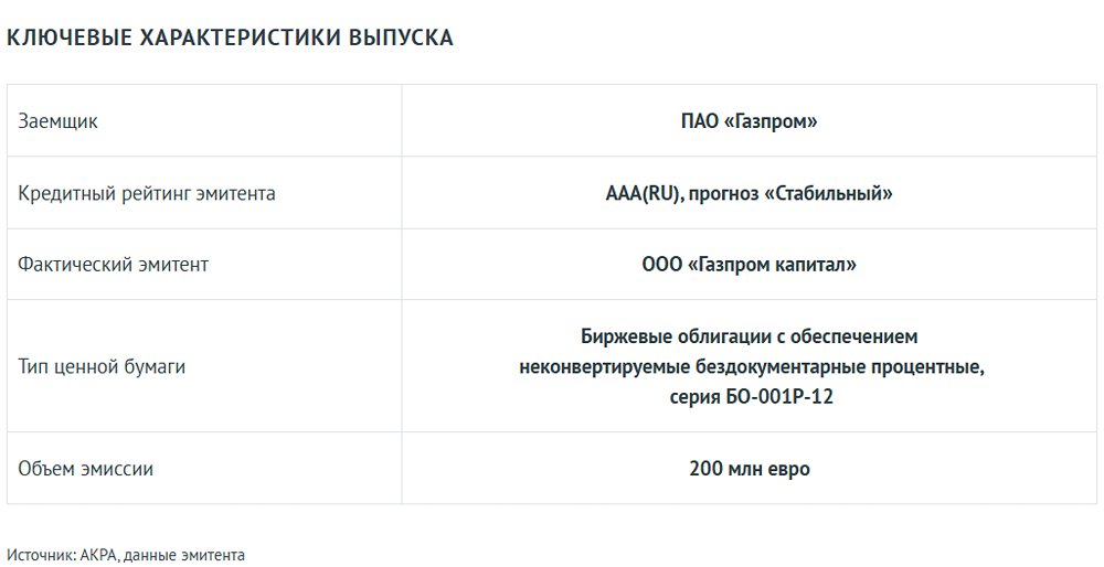АКРА присвоило рейтинг eAAA(RU) выпуску облигаций Газпром капитал. АКРА присвоило ожидаемый кредитный рейтинг eAAA(RU) выпуску облигаций ООО «Газпром капитал» серии БО-001Р-12. Поручителем выступает ПАО «Газпром» с рейтингом AAA(RU), прогноз «Стабильный». Рейтинг эмиссии приравнен к рейтингу поручителя из-за отсутствия субординации. ПАО «Газпром» — крупнейшая мировая энергетическая компания, лидер по добыче газа и нефти. Рейтинг учитывает сильную поддержку государства, высокий бизнес-профиль, низкий отраслевой риск и финансовую устойчивость. Финальный рейтинг будет установлен после получения документации. Ожидаемый рейтинг присвоен впервые, следующее рейтинговое действие планируется через год. Присвоение рейтинга основано на данных ПАО «Газпром», ООО «Газпром капитал», открытых источниках и базах данных АКРА. Конфликтов интересов не выявлено. Источник: www.acra-ratings.ru