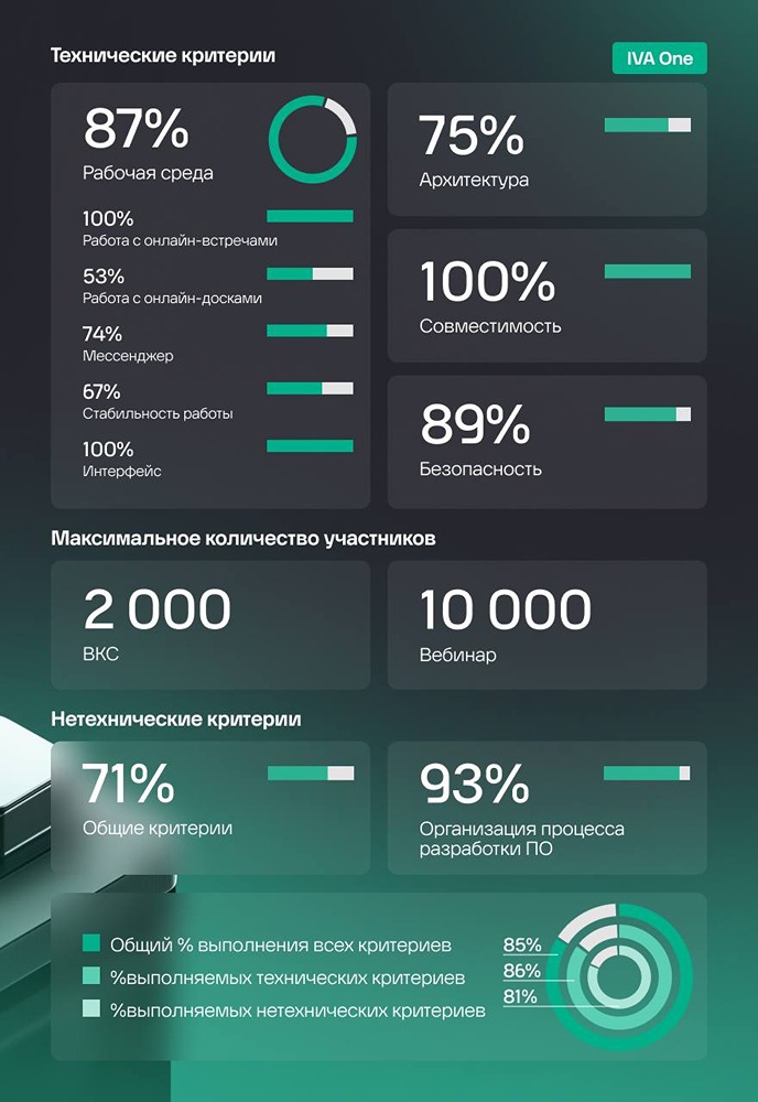 IVA One высоко оценена за технологическую зрелость. Было проведено исследование отечественных ИТ-решений, и стало известно, что платформа для коммуникаций IVA One получила высокую оценку за свою технологическую зрелость. Эксперты оценили платформу по нескольким ключевым параметрам, среди которых: -технические характеристики — удобство интерфейса, стабильность работы, архитектура, безопасность, совместимость и многое другое; -общие характеристики — сертификация, формат поставки, поддержка и организация разработки программного обеспечения; -возможности ВКС — максимальное количество участников видеоконференций и вебинаров. Источник: https://t.me/ivauc