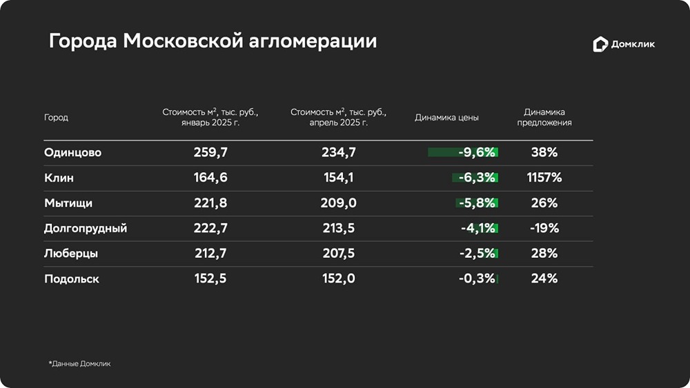 Динамика цен на новостройки в среднем по России и в отдельных региональных центрах. Эксперты Аналитического центра Домклик провели исследование, чтобы выяснить, в каких городах России снизились цены на новостройки. Для этого они изучили объявления о продаже квартир в новостройках на начало января и конец апреля 2025 года. В результате исследования были выявлены города, где стоимость квадратного метра в новостройках уменьшилась. Среди них оказались: -Абакан — снижение на 12,2%; -Нефтеюганск — снижение на 6,5%; -Саранск — снижение на 5,5%. Кроме того, снижение цен наблюдалось и в городах Московской агломерации, особенно в Одинцове, где стоимость квадратного метра в новостройках уменьшилась на 9,6%. Эксперты также отметили, что в среднем по России с начала года цены на новостройки выросли на 2,3%, а количество предложений уменьшилось на 2%. Однако во многих городах, включая региональные центры, стоимость квадратного метра в новостройках снижалась. В среднем по таким городам снижение цен составило 4%. Кроме того, количество объявлений о продаже новостроек увеличилось на 15%, что может свидетельствовать о росте предложения на фоне снижения спроса. Наибольшее снижение цен на новостройки было зафиксировано в Абакане, столице Республики Хакасия. Там стоимость квадратного метра в новостройке снизилась на 25 тысяч рублей, или на 12,2%. На втором месте — Нефтеюганск, один из крупнейших городов Ханты-Мансийского автономного округа. Здесь цены на новостройки уменьшились примерно на 10 тысяч рублей, или на 6,5%. Третье место занимает Саранск, столица Республики Мордовия, с показателем снижения в 5,5%. Стоит отметить, что в Абакане, Нефтеюганске и Петропавловске-Камчатском наблюдалось значительное увеличение количества предложений, например, в Нефтеюганске на 30%. Это могло стать одной из причин снижения цен. В Кемерове стоимость квадратного метра в новостройках снизилась на 4,3%. В других городах, являющихся региональными центрами, снижение было менее значительным: от почти 2% в Сыктывкаре до 0,4% в Архангельской области. Отдельно стоит выделить курортные города, такие как Железноводск, Пионерский и Горячий Ключ, где снижение цен составило от 2,6% до 3%. Аналитики также отметили отрицательную ценовую динамику в городах Московской области, где наблюдается высокая строительная активность. Наибольшее снижение цен было зафиксировано в Одинцове, где стоимость квадратного метра в новостройке уменьшилась почти на 10%, или на 25 тысяч рублей. В тройку лидеров также вошли Клин (снижение на 6,3%) и Мытищи (снижение на 5,8%). На основе полученных данных эксперты пришли к выводу, что одной из причин снижения цен может быть избыток предложений. Так, в Одинцове количество предложений новостроек увеличилось на 38%, а в Люберцах — на 28%. Особенно выделяется Клин с показателем 1000%, но это связано с эффектом низкой базы — в этом городе недавно были запущены новые проекты. Источник: www.sberbank.ru