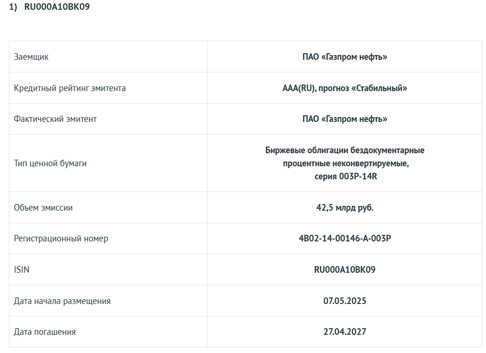 Кредитные рейтинги облигаций ПАО «Газпром нефть». Аналитическое Кредитное Рейтинговое Агентство присвоило кредитные рейтинги двум выпускам облигаций ПАО «Газпром нефть» серий 003P-14R (RU000A10BK09) и 003P-15R (RU000A10BK17). Оба выпуска являются старшими необеспеченными долговыми обязательствами ПАО «Газпром нефть» (далее — Компания, Группа, «Газпром нефть»). Поскольку эти облигации не имеют структурной и контрактной субординации, АКРА оценивает их как равные по приоритету исполнения другим существующим и будущим необеспеченным и несубординированным обязательствам Компании. В соответствии с методологией АКРА, применяется упрощённый подход, при котором кредитный рейтинг выпусков приравнивается к кредитному рейтингу Компании и устанавливается на уровне AAA(RU). Кредитный рейтинг Компании обусловлен её сильной рыночной позицией и очень сильным бизнес-профилем, высоким уровнем корпоративного управления, а также высокой вероятностью получения экстраординарной поддержки от ПАО «Газпром» (рейтинг АКРА — AAA(RU), прогноз «Стабильный»). Финансовый риск-профиль базируется на крупных масштабах Компании, высокой рентабельности, низкой долговой нагрузке с высоким уровнем обслуживания долга, а также на высокой ликвидности. Информация, использованная при присвоении кредитного рейтинга, была предоставлена ПАО «Газпром нефть», получена из открытых источников и баз данных АКРА. Кредитный рейтинг был присвоен впервые. Пересмотр рейтинга ожидается в течение года с момента публикации данного пресс-релиза. Кредитный рейтинг был присвоен на основе данных, которые, по мнению АКРА, являются качественными и достаточными для применения методологий. АКРА также предоставляло ПАО «Газпром нефть» дополнительные услуги. Конфликты интересов в процессе присвоения кредитного рейтинга не выявлены. Источник: www.acra-ratings.ru