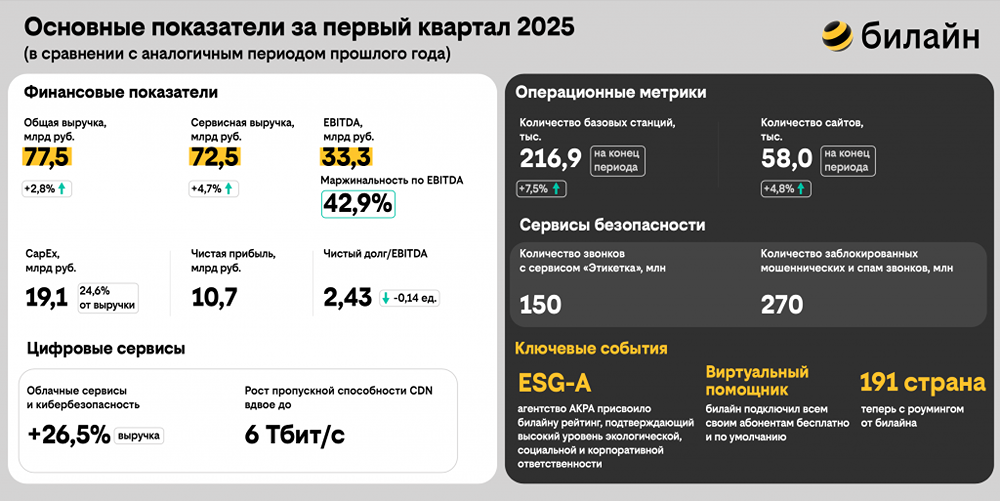 ПАО «ВымпелКом» представляет результаты своей работы за первый квартал 2025 года. Выручка за отчетный период достигла 77,5 млрд рублей, увеличившись на 2,8% по сравнению с аналогичным периодом прошлого года. Рост обусловлен увеличением сервисной выручки на 4,7%, что связано с ростом потребления телекоммуникационных услуг и цифровых сервисов. EBITDA выросла на 4,0% и составила 33,3 млрд рублей, что свидетельствует о повышении операционной эффективности, несмотря на рост операционных расходов. Рентабельность EBITDA увеличилась до 42,9%, что говорит о более высокой прибыльности бизнеса. Чистая прибыль за квартал достигла 10,7 млрд рублей. Капитальные затраты увеличились до 19,1 млрд рублей, что связано с ускорением инвестиций в инфраструктуру и проектами, реализуемыми по графику. Интенсивность капитальных вложений выросла до 24,6%. В то же время, долговая нагрузка снизилась до 2,43, а средняя ставка по долгам осталась на уровне 12,14%, что значительно ниже ключевой ставки ЦБ РФ. Основные направления развития и ключевые события. Телекоммуникационный бизнес. Компания внедрила сервис «Виртуальный помощник», который помогает защищать клиентов от мошенничества, блокируя спам и мошеннические звонки. В первом квартале было заблокировано 270 миллионов мошеннических звонков, а также увеличено число звонков с корпоративным сервисом «Этикетка». Основным каналом мошенничества стал мессенджер WhatsApp (WhatsApp принадлежит корпорации Meta. Meta (в прошлом Facebook) признана в России экстремистской организацией и запрещена на территории страны), на который приходится 70% попыток обмана. В рамках расширения услуг запущены безлимитные тарифы для видеосервисов и партнерство с футбольным клубом ЦСКА. Также улучшены условия роуминга и расширена география — теперь доступно 210 стран. Цифровые сервисы. Выручка в сегменте облачных решений и кибербезопасности выросла на 26,5%. Компания модернизировала сеть доставки контента CDN, увеличив пропускную способность вдвое, что обеспечивает стабильный доступ к контенту. В сотрудничестве с платформой Platformcraft обновлен сервис CDN для интеграции решений по доставке контента. Реклама и аналитика. Расширена сеть для трансляции рекламы — установлено 2,5 тысячи новых экранов в ритейле. Запущен ИИ-помощник для создания рекламных текстов и таргетированных SMS-рассылок. В рамках партнерства с компанией red_mad_robot разрабатываются новые ИИ-инструменты для автоматизации бизнес-процессов. Также расширено использование геоаналитики для поиска перспективных территорий для найма сотрудников. Инфраструктура. Компания продолжает активно инвестировать в развитие сети: количество базовых станций выросло на 7,5%, а число площадок — на 4,8%. Объем дата-трафика увеличился на 11,4% и достиг 2433 петабайт. Внедрены технологии VoLTE и VoWiFi, рост которых составил 24% и 36% соответственно. Также завершен проект по переводу клиентов на технологию IPoE, что повышает качество соединения и удобство пользования интернетом. Корпоративные инициативы. Билайн получил рейтинг ESG-А, подтверждающий высокий уровень ответственности. В рамках национальных проектов компания стала партнером по направлениям «Демография», «Наука и образование». Венчурный фонд «ХАЙВ» инвестировал в стартап Target AI, разрабатывающий платформы для автоматизации бизнеса Источник: www.beelinenow.ru