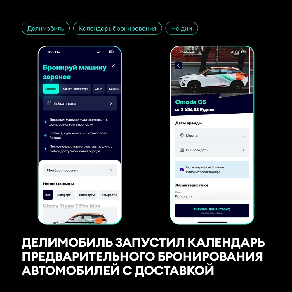 Делимобиль запустил функцию предварительного бронирования автомобилей с доставкой. Делимобиль вводит возможность заранее бронировать автомобили через новый календарь в приложении. Теперь пользователи могут выбрать машину к определенной дате и времени. Сервис доступен в разделе «На дни». Эта функция особенно полезна для длительных поездок от одного дня. Календарь позволяет планировать поездки на срок до шести месяцев вперед. Делимобиль предлагает доставку и мойку автомобиля за 900 рублей. Это решает проблемы с поиском и подготовкой машины. Теперь пользователи могут заказать автомобиль с доставкой к дому или в один из 15 городов сети. Для бронирования доступны популярные модели в категориях Эконом, Комфорт и Supreme: Geely Coolray, Haval Jolion, Chery Tiggo 7 и другие. Аренда возможна в любой точке зоны обслуживания, как при обычной поминутной аренде. Гибкие условия отмены и отсутствие депозита делают сервис удобным. Приложение Делимобиля обновилось: появился новый визуальный макет главного экрана, изменился интерфейс и добавлен таббар. Теперь в приложении есть полноценный mini-app для бронирования. Андрей Крупнов, директор по стратегии и росту, сказал: «Делимобиль постоянно создает новые цифровые продукты. Опция предварительного бронирования всегда была востребована. Мы решили запустить ее перед летним сезоном. Надеемся, что этим летом тысячи людей воспользуются услугой. Это положительно скажется на нашем бизнесе. Теперь миллионы пользователей могут планировать поездки заранее и быть уверенными в доступности автомобиля. Можно забронировать машину даже с доставкой в другой город. С Делимобилем семья отправится в путешествие на кроссовере, компания друзей получит стильный автомобиль на выходные, а бизнесмен закажет премиальный седан в командировку. Бронирование «На дни» дает свободу передвижения и помогает строить долгосрочные планы». Источник: www.invest.delimobil.ru