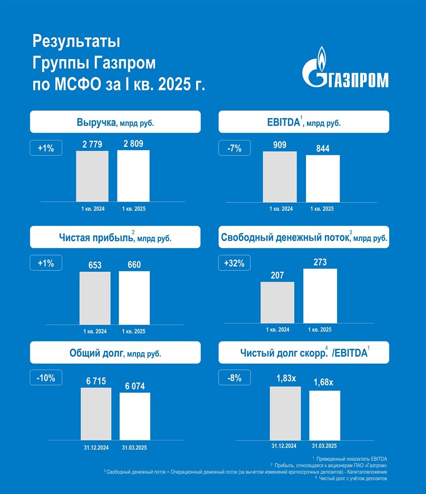 ПАО «Газпром» представляет промежуточный сокращённый отчёт о совокупном доходе за три месяца, закончившиеся 31 марта 2025 года. В первом квартале текущего года «Газпром» получил чистую прибыль в размере 660 миллиардов рублей, что на 1 миллиард рублей больше, чем в аналогичном периоде прошлого года. Показатель EBITDA группы "Газпром" по итогам I квартала составил 909 млрд руб. Уровень долговой нагрузки "Газпрома" по итогам I квартала по показателю чистый долг/EBITDA снизился до 1,68 с 1,83 на конец 2024 г. Источник: https://t.me/gazprom