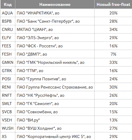 Новые коэффициенты free-float для ценных бумаг компании Россети. Московская Биржа, по рекомендации Индексного комитета, обновила базы расчета индексов акций с 20 июня 2025 года. Были установлены новые коэффициенты free-float и дополнительные весовые коэффициенты для ряда ценных бумаг. Из расчета Индекса МосБиржи и Индекса РТС исключат акции ПАО "Селигдар" и ПАО "Мечел". В базу Индекса средней и малой капитализации войдут акции ПАО "Группа "Русагро", МКПАО "ЦИАН", ПАО "РусГидро" и ПАО "ВУШ Холдинг". Индекс акций широкого рынка пополнят акции ПАО "Группа "Русагро", ПАО "НПК ОВК" и МКПАО "ЦИАН". Из него выйдут привилегированные акции ПАО "Казаньоргсинтез", акции ПАО МФК "Займер" и ПАО "ИВА". Отраслевой Индекс химии и нефтехимии лишится привилегированных акций ПАО "Казаньоргсинтез". Из Индекса финансов исключат акции ПАО МФК "Займер". Акции ПАО "Группа "Русагро" появятся в Индексе потребительского сектора. В Индексе информационных технологий будут представлены акции МКПАО "ЦИАН". В лист ожидания на включение в Индексы МосБиржи и РТС войдут акции МКПАО "ЦИАН", ПАО "ЭсЭфАй", ПАО "Группа "Русагро" и ПАО "Корпоративный центр ИКС 5". Акции ПАО Группа Астра, ПАО "РусГидро" и ПАО "Россети" попадут в лист ожидания на исключение из Индексов МосБиржи и РТС. Новые коэффициенты free-float для ценных бумаг доступны на сайте. Источник: www.moex.com