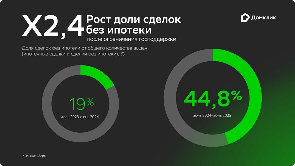 Исследование Домклик: как изменился рынок ипотеки после завершения льготных программ. Аналитический центр Домклик провёл исследование, в котором проанализировал развитие ипотечного рынка в России после отмены льготных программ. Напомним, что с 1 июля 2024 года в стране прекратила действовать программа «Господдержка», которая позволяла оформить ипотеку на новостройки по ставке 8%. Также были внесены изменения в программу «Семейная ипотека», сделав её более адресной. В результате объёмы выдач ипотеки значительно снизились, особенно это коснулось рыночных программ. Это произошло из-за повышения ключевой ставки до 21% во втором полугодии, что сделало ипотеку без льготного финансирования менее привлекательной. Так, объёмы выдачи ипотеки по рыночным условиям сократились в 2,8 раза — с 1,4 трлн рублей до 490 млрд рублей за период с июля 2024 года по июнь 2025 года. Вторичное жильё стало более популярным без использования ипотеки. В условиях ограничения льготной ипотеки и роста ключевой ставки часть потенциальных заёмщиков начали покупать жильё без использования ипотеки. Если до отмены льготного кредитования доля неипотечных сделок в выдачах Сбера не превышала 19%, то с июля 2024 года она стабильно держалась на уровне 35%. Пик спроса на неипотечные сделки пришёлся на январь 2025 года, когда их доля составила почти 61%. Однако и после этого в течение первого полугодия 2025 года доля таких сделок оставалась на высоком уровне, превышая 40%. Наибольшим спросом на рынке неипотеки пользуется вторичное жильё — его доля по итогам первого полугодия составила более 60%. В то время как новостройки можно приобрести по льготной ставке, пусть и с ограничениями, программы господдержки практически не распространяются на готовое жильё. Льготные программы стали основным драйвером рынка новостроек. После отмены массового льготного кредитования доля программ с господдержкой в общем объёме выдач выросла почти на 10%. Если до этого доля льготных программ составляла 67%, то после она приблизилась к 77%. По итогам года, когда льготная ипотека была ограничена, наиболее востребованным типом жилья остаются новостройки — 63,8%. На них продолжают распространяться программы господдержки, самая крупная из которых — «Семейная ипотека». Первичное жильё стало единственным видом недвижимости, доля которого увеличилась в общем объёме выдач — на 15,3 процентных пункта. Доля вторичного жилья сократилась на 9,6 процентных пункта, ИЖС — на 5,2 процентных пункта, а готовая загородная недвижимость — всего на 0,5 процентных пункта. Как изменился портрет ипотечного заёмщика. За прошедший год после отмены массовой льготной ипотеки портрет среднестатистического заёмщика по программам с господдержкой изменился незначительно по сравнению с заёмщиками по рыночным программам. Среди заёмщиков, оформивших ипотеку с господдержкой, доля женщин немного превышает долю мужчин — 51% против 49%. 66% заёмщиков состоят в браке. У заёмщиков, оформивших ипотеку с господдержкой, увеличился размер первоначального взноса — с 1,9 млн рублей до 2 млн рублей, а также ежемесячный платёж — до 32,7 тыс. рублей в среднем по России. Срок выплаты ипотечного кредита также увеличился — с 26,5 лет до 27,2 лет. Источник: www.sberbank.ru